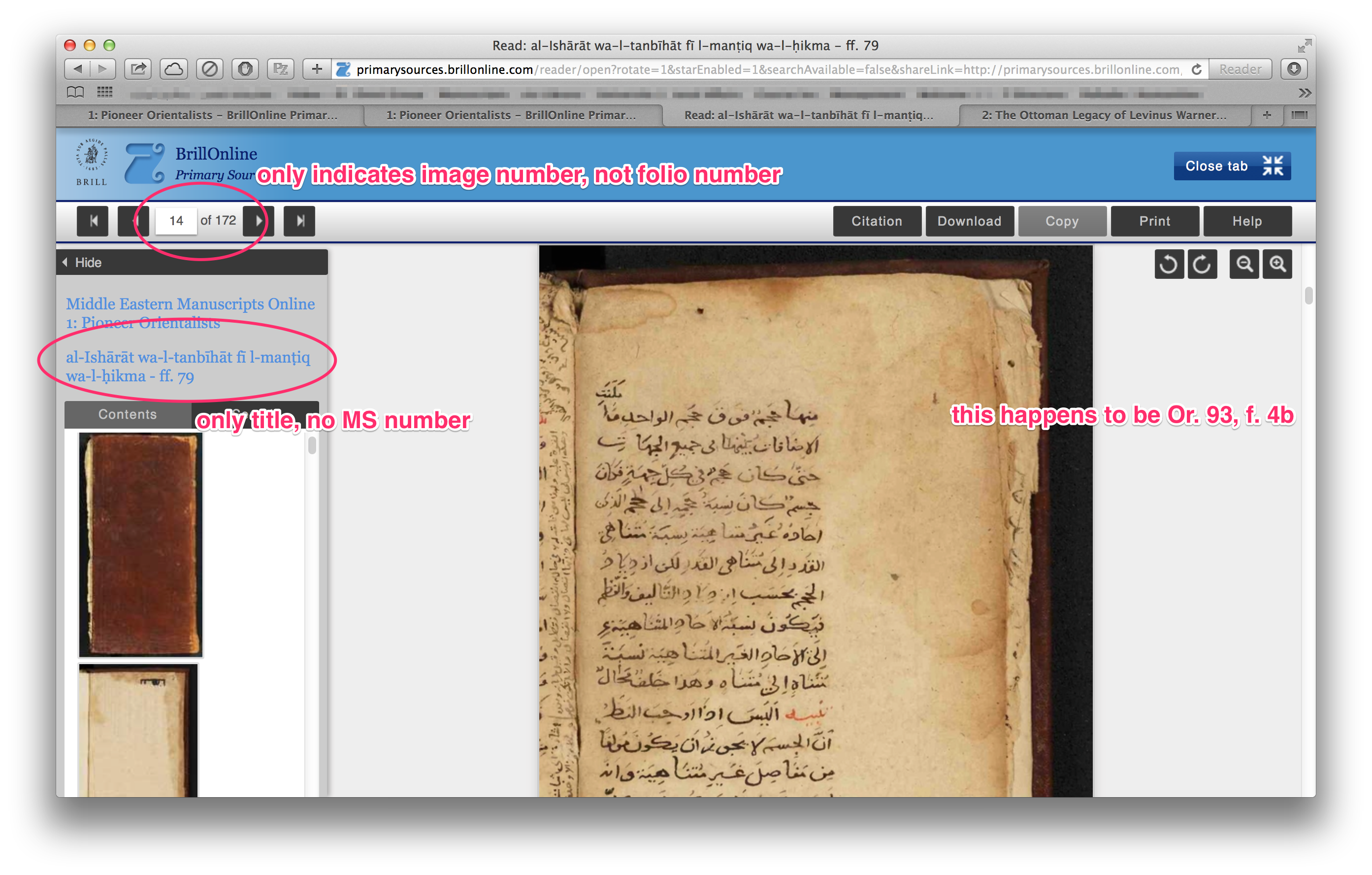 The search function is a bit erratic. From the main page the search box only searches within this collection. But if after one search you want to immediately search again, it has now switched to become a search box for the entire BrillOnline website. This is of course unnecessary tedious and quickly works on your nerves. Searching for specific codices is problematic. For example, Or. 168(11) is the provenance code for a text of a “solution of a geometrical problem”. However, searching for “Or. 168(11)” gives two results; also Or. 203, which happens to have 168 folia. Worse still, searching for “Or. 168” gives only one result: Or. 203! It seems impossible to quickly see what Or. 168 contains. (Solution: Use Jan Just Witkam’s excellent catalogues in crisp digital format available here)