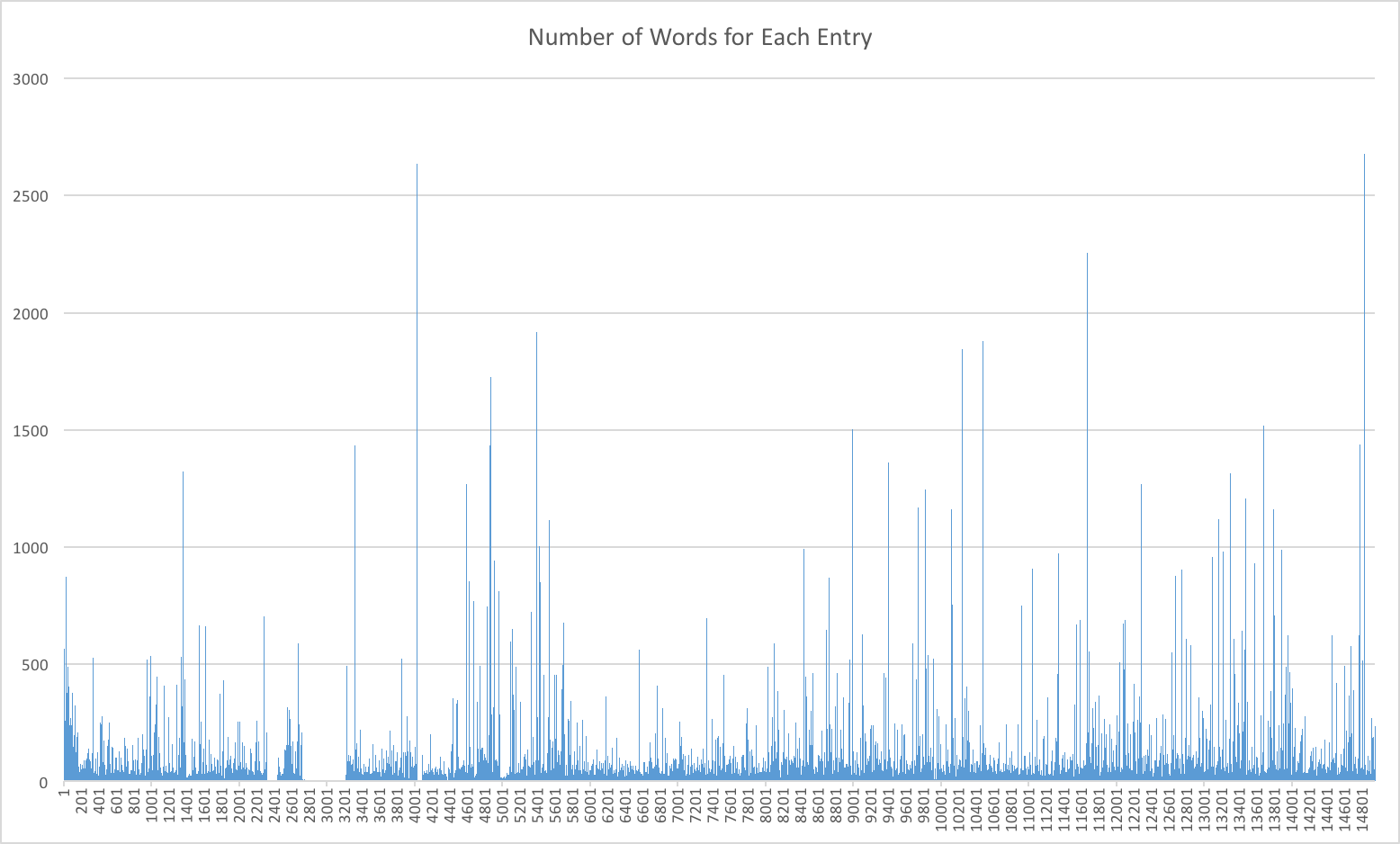 The graph shows that there are a few entries with a very high number of words, that there are more than a few with more than 500 words, but that the majority remains below a hundred. Quite odd is the interval between approximately entries number 2600 and 3200. It falls entirely flat.