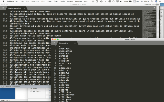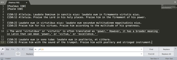 Similarly, empty lines can be deleted. What is left is a new Psalm verse on every two lines, Latin first, then English. Searching on the internet for how to delete every second line in Sublime Text yields a simple method of searching for “.*\n.*\n” and hitting Find All, after which multiple cursors will blink which can be moved from line to line to select all even (or all odd) lines.