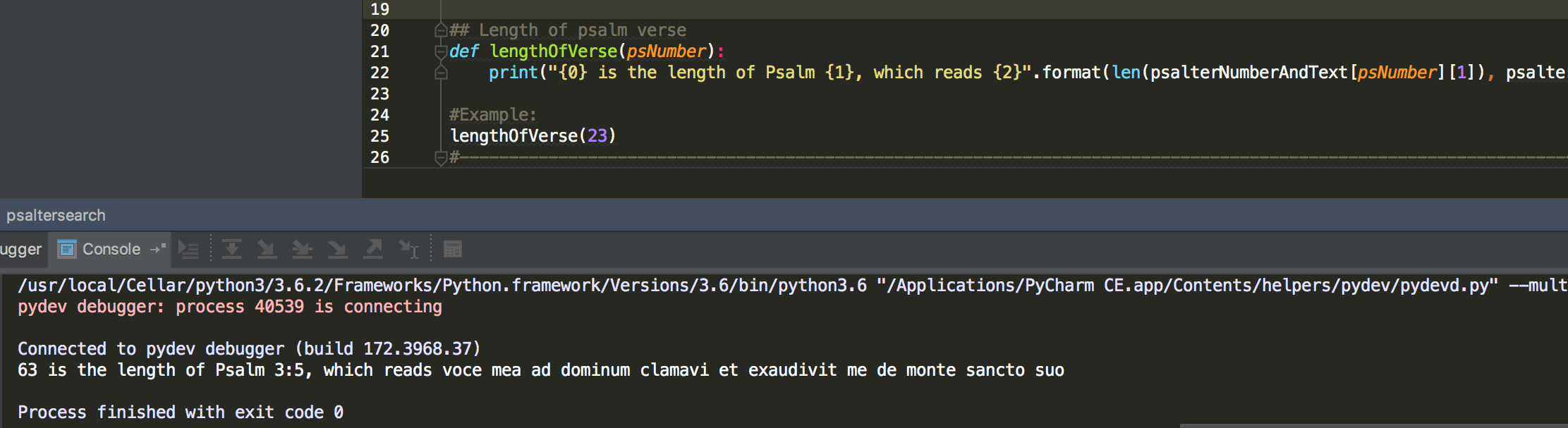 print("{0} is the length of Psalm {1}, which reads {2}".format(len(psalterNumberAndText[psNumber][1]), psalterNumberAndText[psNumber][0], psalterNumberAndText[psNumber][1]))
