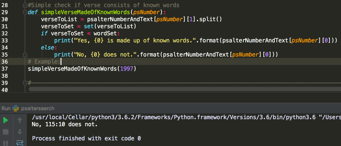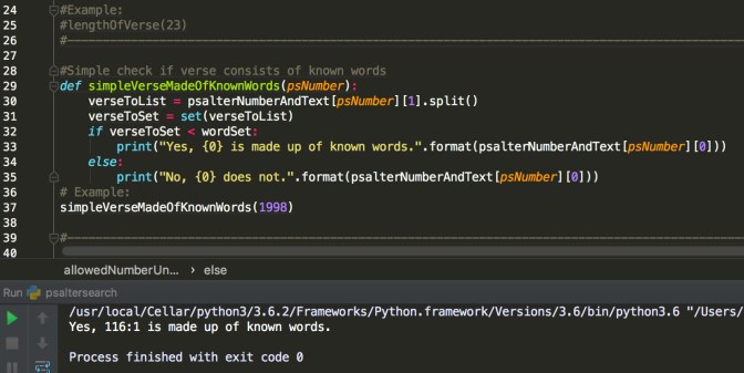 This function takes a verse and checks word by word if the verse is made up of words from a predefined list. In this example, I built up a list of words that are commonly used in Mass or are cognates. I make use of the set functionality in Python. Note that I did not make the function require an input of chapter number / verse number, but rather only one number that encapsulates both. Thus in the two examples above I use 1998 and 1997 to represent Psalm 116:1 and 115:10. This is not really human-readable or user-friendly, but is sufficient if we want to use this function for machine purposes, such as looping through all verses.