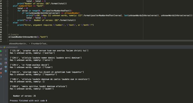 Of course, normally we would fetch those verse numbers and the unknown words in new lists so that we can do subsequent analysis on it. For example, we can add the unknown words to the list of words, to expand it. Iterated as such, we could find out in how many steps we can encapsulate all verses of the Psalter.
