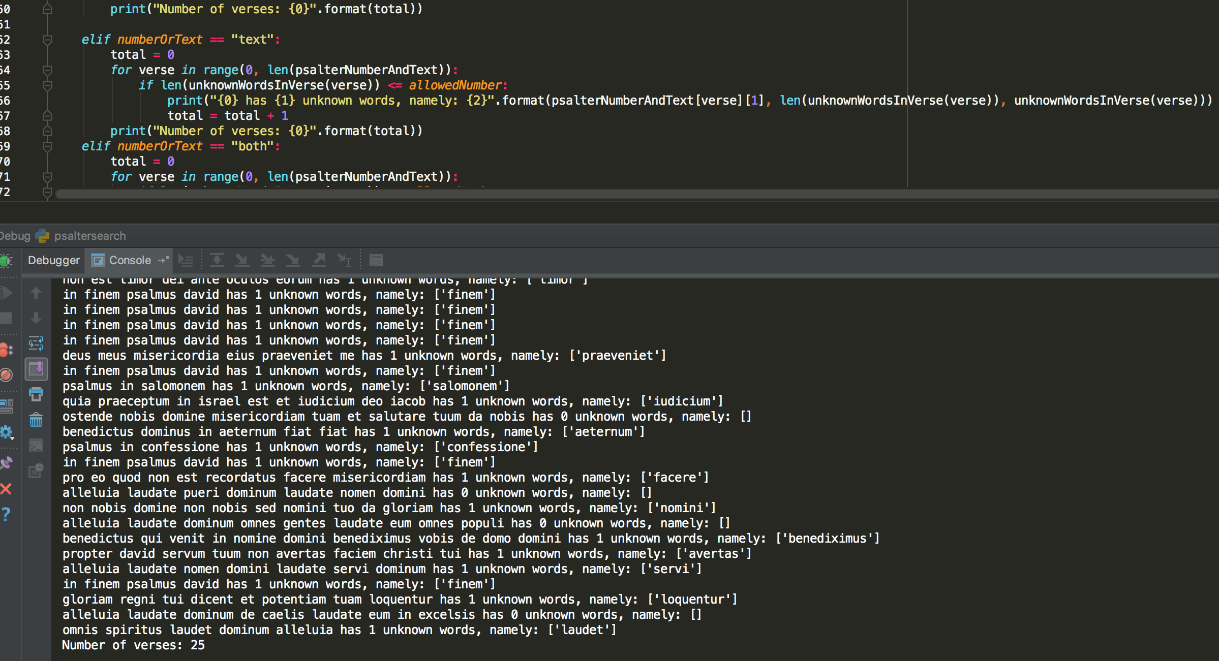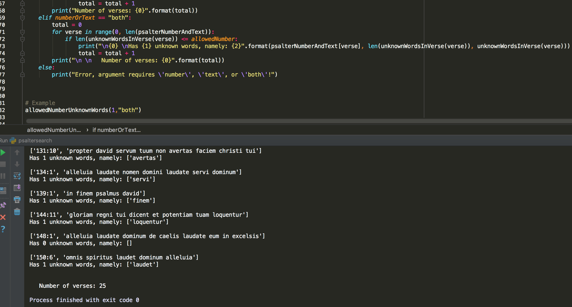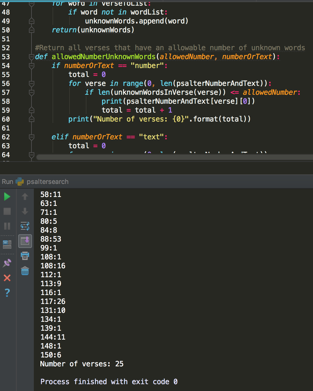 The result is a list of psalm verses of interest, with a final print of the total number of verses found.