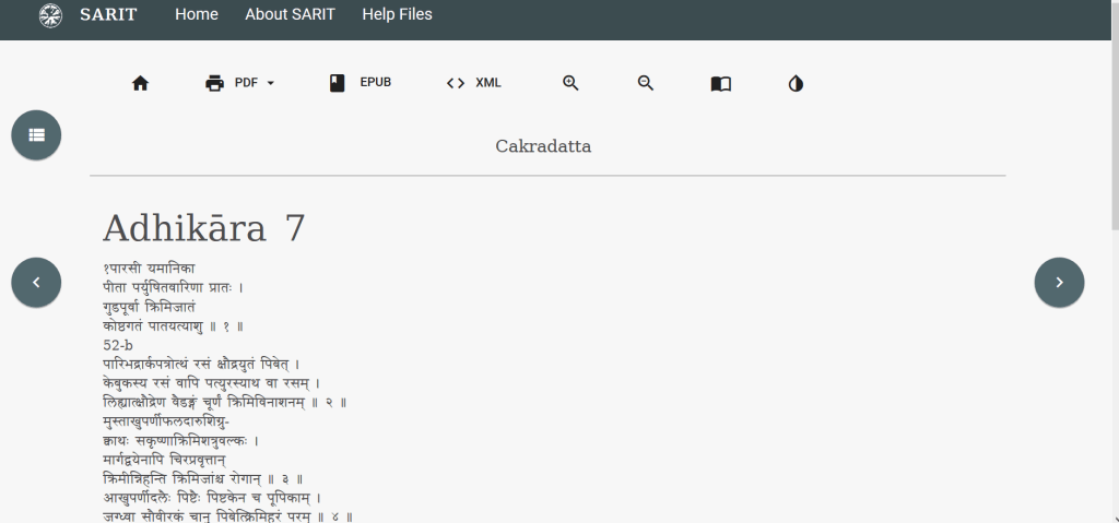 SARIT offers very detailed metadata of the texts it contains, and gives the chance to search both within texts and metadata. Moreover, you are able to check the TEI XML encoding and download the chosen text in PDF or EPUB formats. The SARIT database provides not only the roman-script transliteration of the texts, but in certain instances also the text in Devanagari – a characteristic that neither GRETIL nor TITUS have.