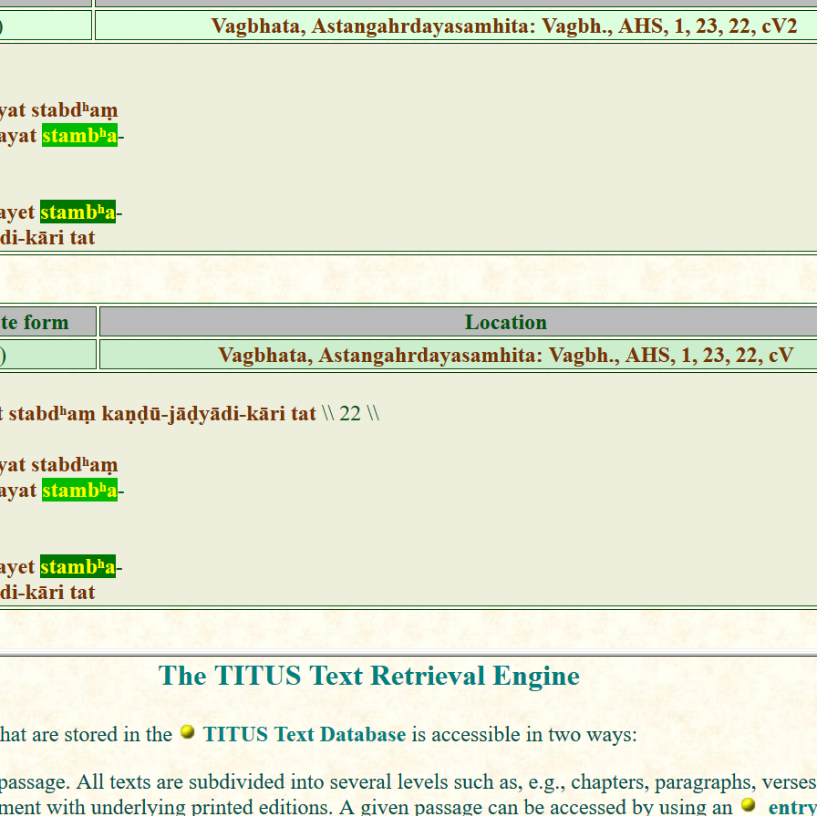 - TITUS, on the other hand, is more of a web-based resource, that gives you the chance to search within texts at different levels: you can search within a single text, the chapter, subchapter, the sentence, the verse or half-verse that you are looking for; you can also perform wider searches – for instance on the whole Titus corpus of Sanskrit texts – by word index. In this case, if you are looking for the word stambha (pillar) you will get all the occurrences of it within the texts that TITUS offers.