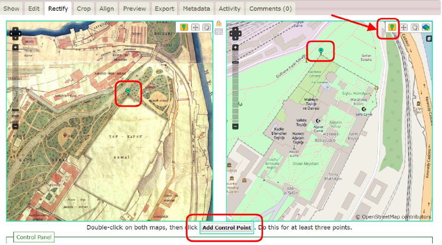 With the Add Control Point tool, mark a common point on your historical map and the current map. To fix the points that you marked on the map, you need to click on the Add Control Point button at the bottom. To successfully reference the entire map you should add at least 50 points.