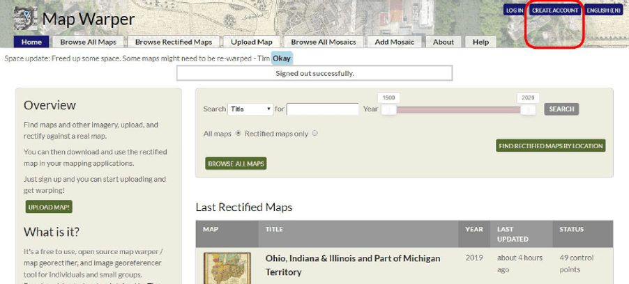 First of all, you have to create a user account on Map Warper’s website by clicking on the Create Account tab.