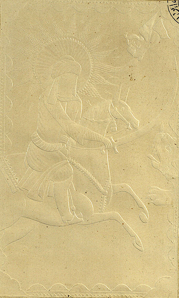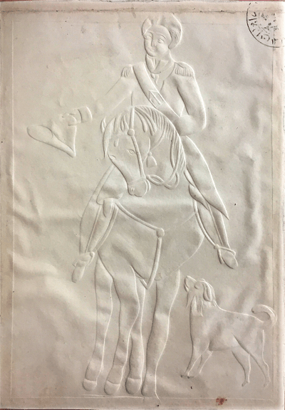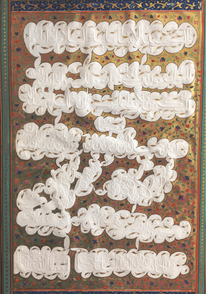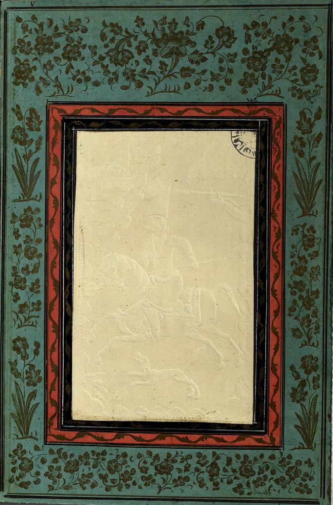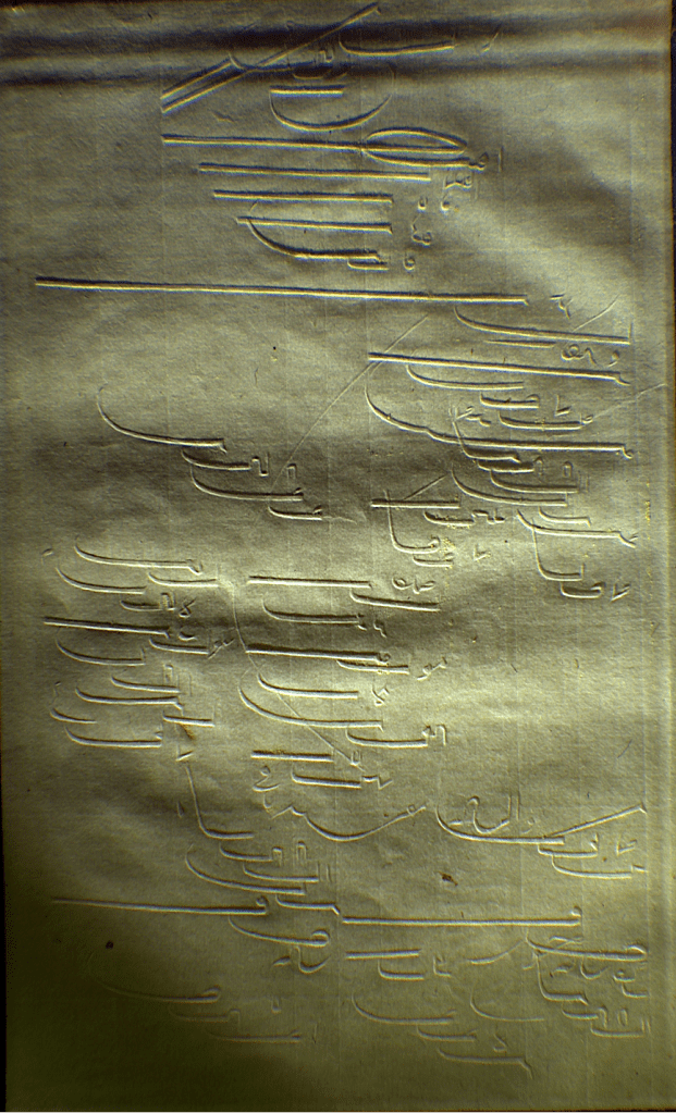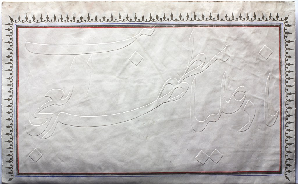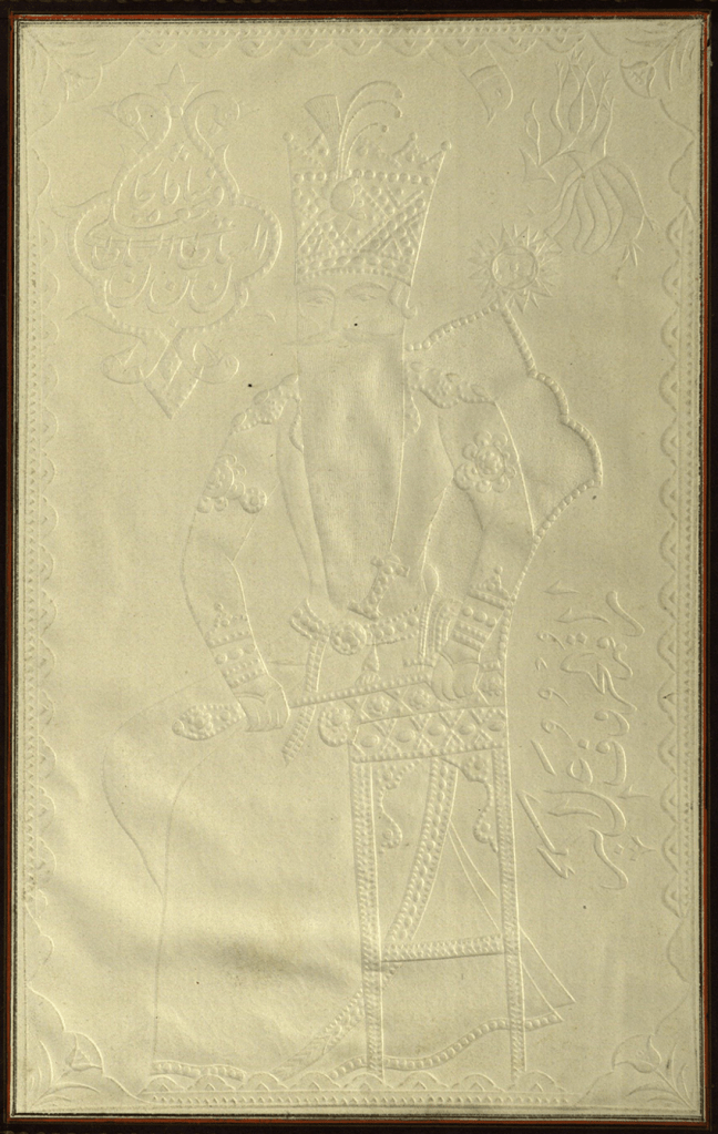 This technique is probably the least familiar in Islamic art, even among experts of the field, and even in its birthplace, Iran. It presents a three dimensional effect on paper, created with nail pressure from both sides in order to make an embossed effect. It is rendered with the thumb and usually the ring finger; hence, the name “Fingernail Art” (fig. 1).[1]