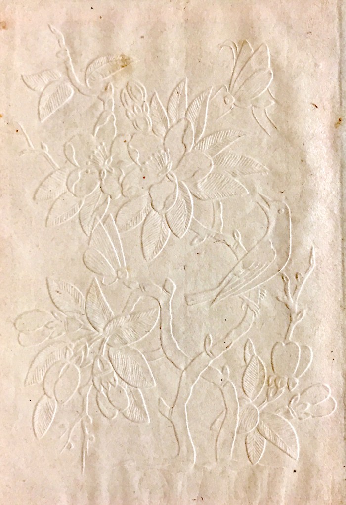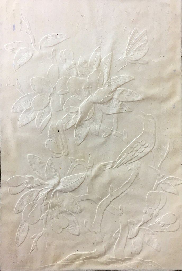Fingernail artworks either display text, in the form of calligraphy, or a representational composition, involving human figures, animals or flowers. The embossed effect on the paper creates a relief – like bas-relief on marble – in which instead of ink or colours outlining the forms and shapes, the eye is presented with a delicate interaction between light and shadow. A ‘tactile vision’, one might call it (fig. 2). Therefore, the viewing angle and light play significant roles in the presentation of fingernail artworks.