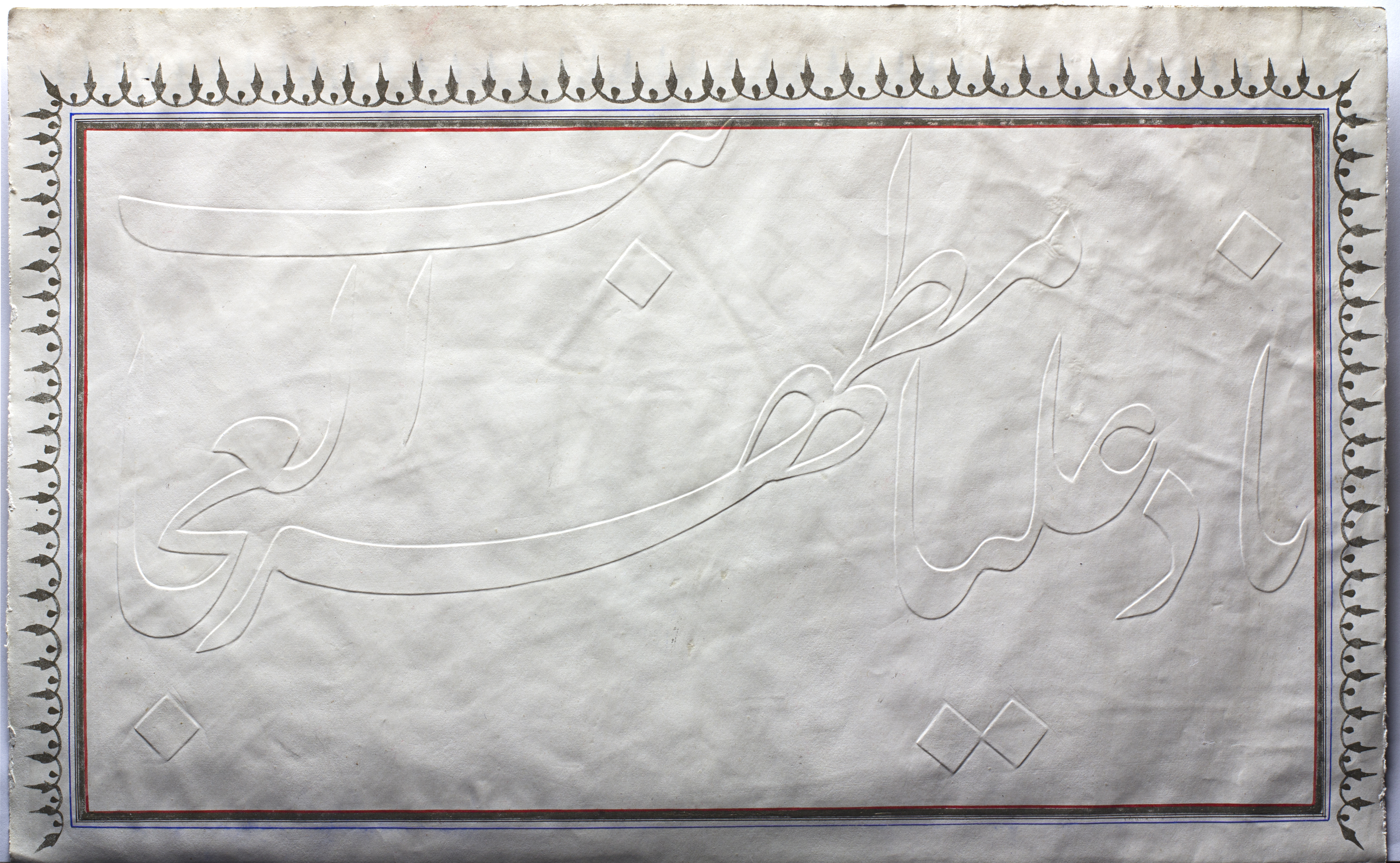 This technique is probably the least familiar in Islamic art, even among experts of the field, and even in its birthplace, Iran. It presents a three dimensional effect on paper, created with nail pressure from both sides in order to make an embossed effect. It is rendered with the thumb and usually the ring finger; hence, the name “Fingernail Art” (fig. 1).[1]