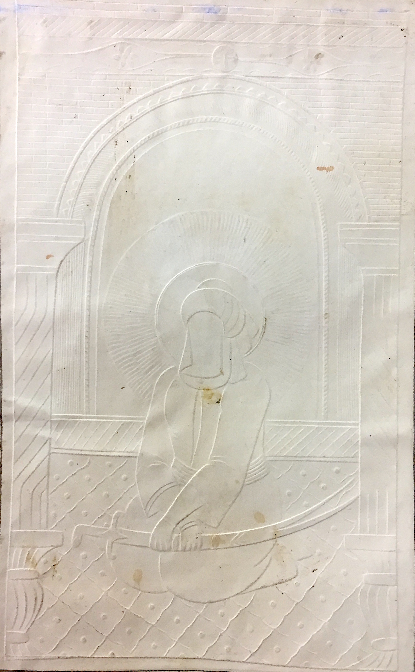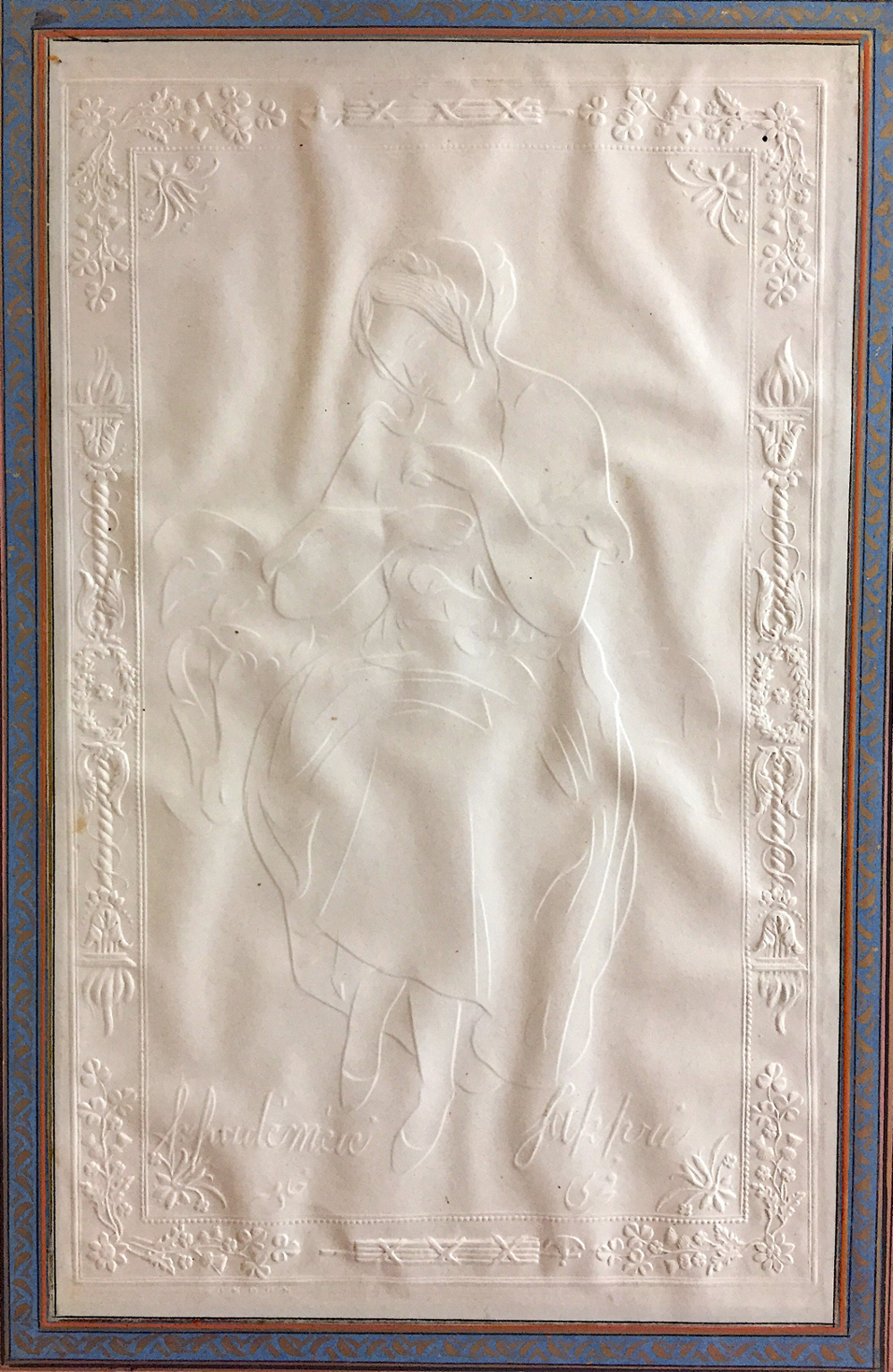 Fingernail artworks either display text, in the form of calligraphy, or a representational composition, involving human figures, animals or flowers. The embossed effect on the paper creates a relief – like bas-relief on marble – in which instead of ink or colours outlining the forms and shapes, the eye is presented with a delicate interaction between light and shadow. A ‘tactile vision’, one might call it (fig. 2). Therefore, the viewing angle and light play significant roles in the presentation of fingernail artworks.