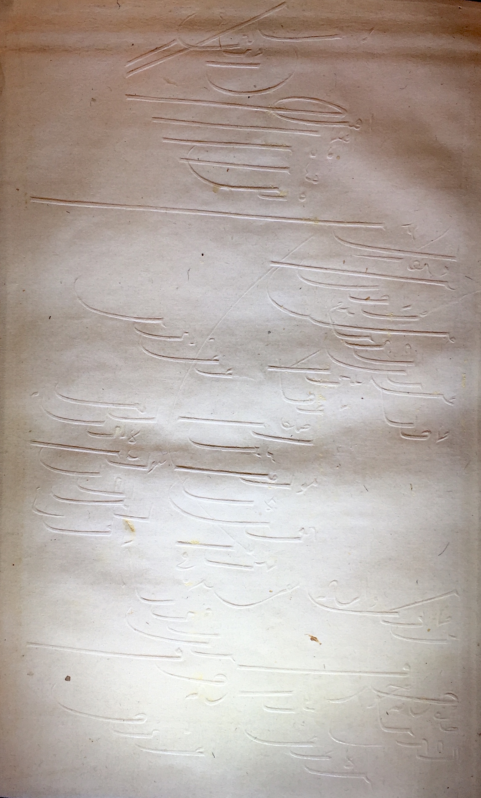 Persian arts of the book as reflected in manuscripts have often included sumptuous decorations and lavish use of pure gold and precious pigments, such as lapis lazuli (for blue). However, the technique I am going to discuss here is at the other end of the spectrum: with no ink, pigments, gold or brushes, this medium is so minimalistic it involves only a sheet of plain paper and the artist’s fingers.