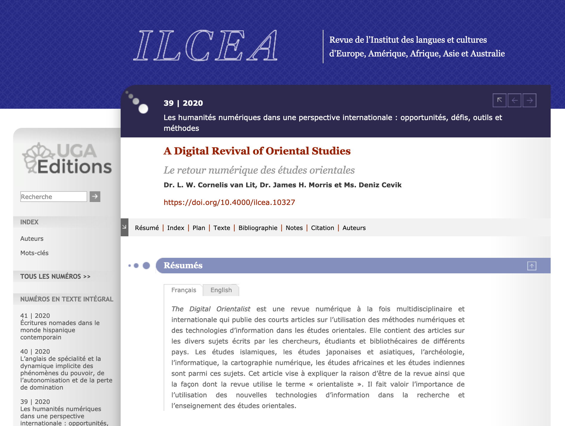 - In February, members of The Digital Orientalist‘s editorial team, L. W. Cornelis van Lit, James H. Morris and Deniz Çevik, published a paper entitled “A Digital Revival of Oriental Studies” in ICLEA. The paper can be read here.