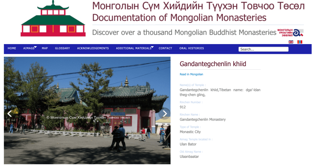 The Documentation of Mongolian Monasteries is an online database featuring more than a thousand historical and extant Buddhist sites in the Mongolian People’s Republic. In addition to providing comprehensive geospatial data and extensive notes on the Buddhist sites, the database is also an invaluable trove for oral histories as well as many other indispensable resources on Mongolian Buddhism.