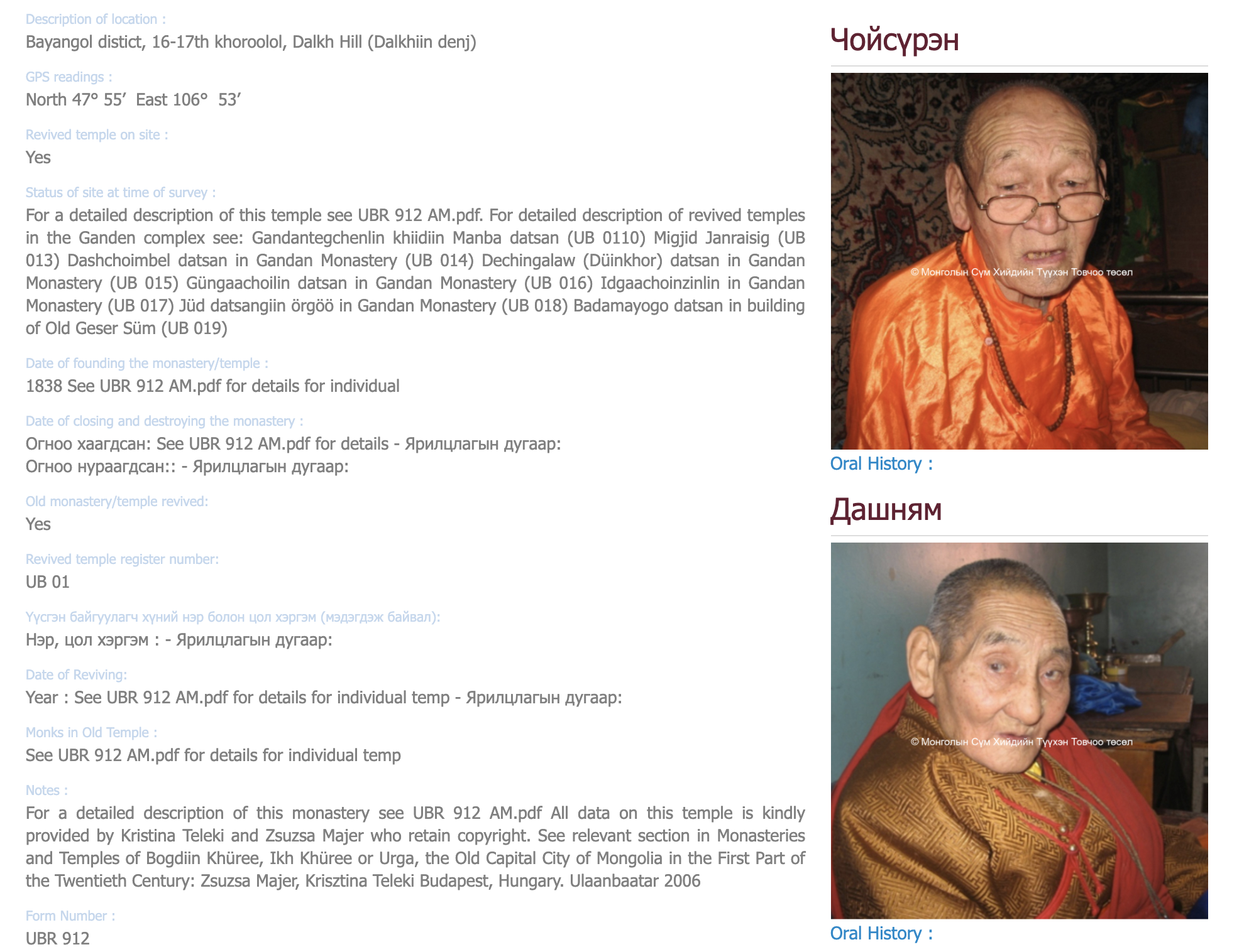 Most pages for individual Buddhist sites also contain comprehensive notes on their history written both in Mongolian and English. Some incredibly useful information they provide include: founding persons and dates, historical monastic populations (prior to the Great Purge), dates of destruction, restoration status, status of the sites at the time of survey, and linked oral histories of the sites.