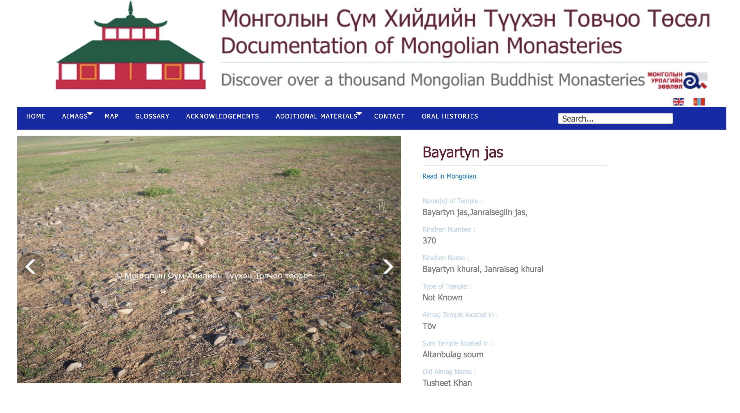 Visitors to the Documentation of Mongolian Monasteries database can discover Buddhist sites either through the interactive map, or by their aimag divisions. Individual webpages for individual Buddhist sites all contain a wealth of information. Visitors can look up different names of the monasteries and temples (in Mongolian and in Tibetan), as well as their historical, contemporary, and GPS locations. Some pages also provide really useful geospatial information such as site dimensions and descriptions of surrounding landmarks (e.g. springs, rivers, mountain pass).