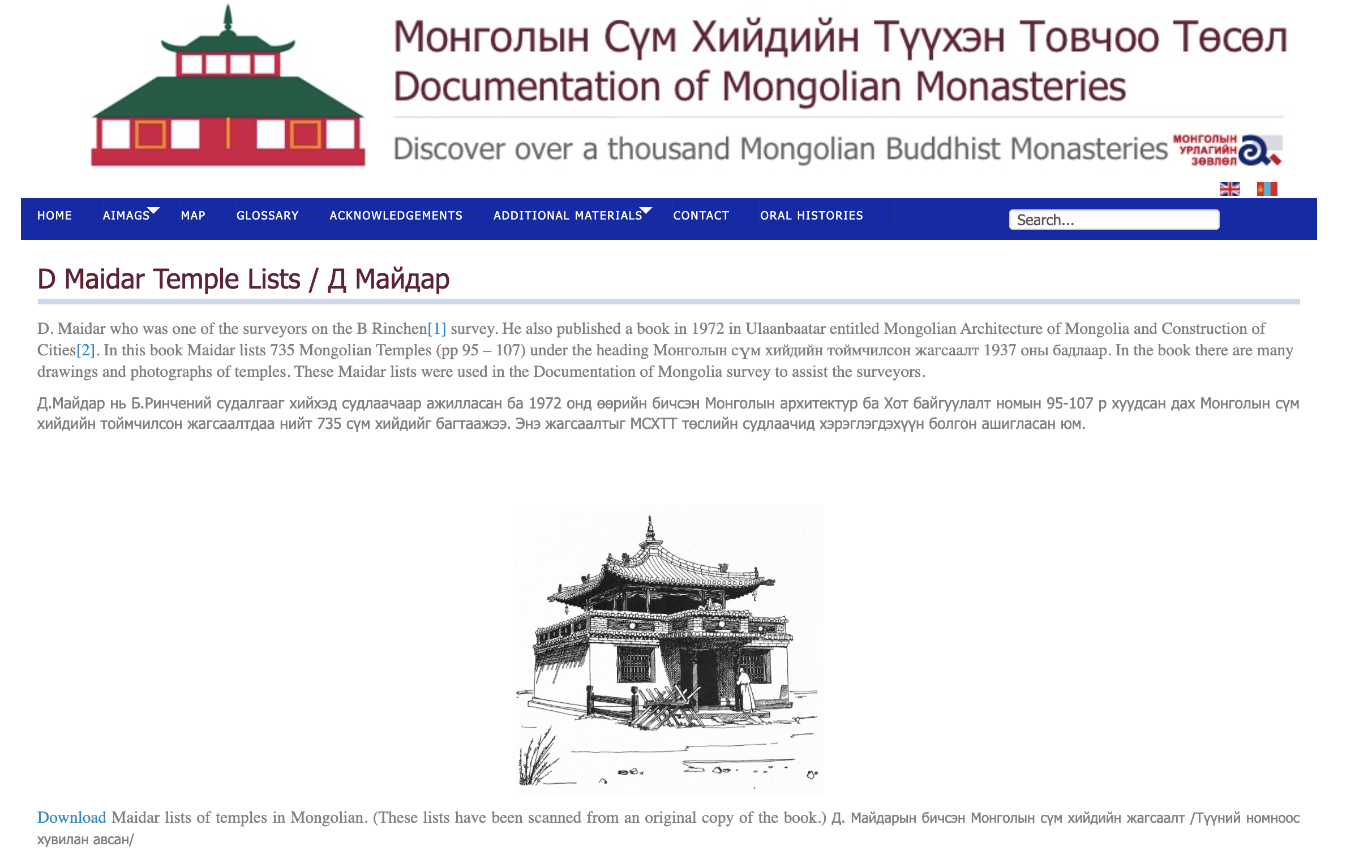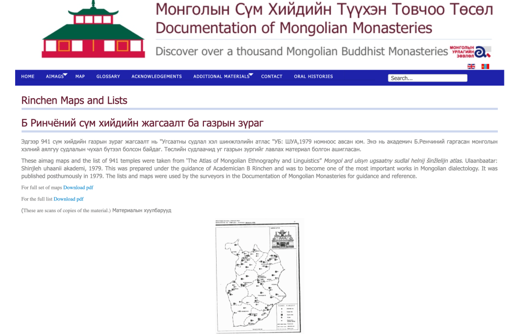 Other helpful resources that the site hosts include maps and lists of Buddhist sites in Mongolia compiled in previously published sources. The full collection of maps featuring 941 Buddhist sites that the Mongolian scholar B. Rinchen created in his 1979 study can be downloaded. Another scholar who participated in B. Rinchen’s 1979 study, D. Maidar, published a book in 1972 listing 735 Buddhist sites in Mongolia. This list is also available on the site under the “Additional Materials” tab.