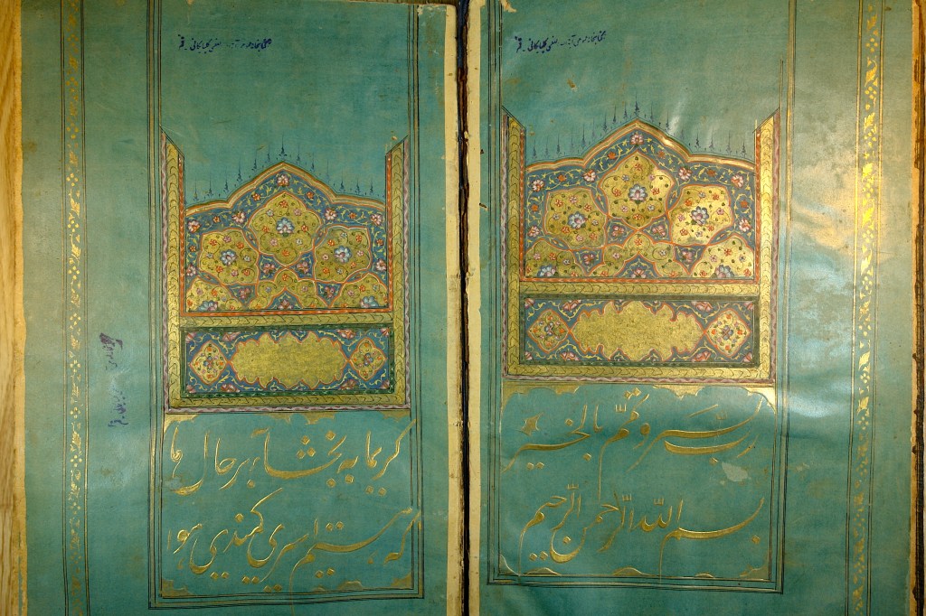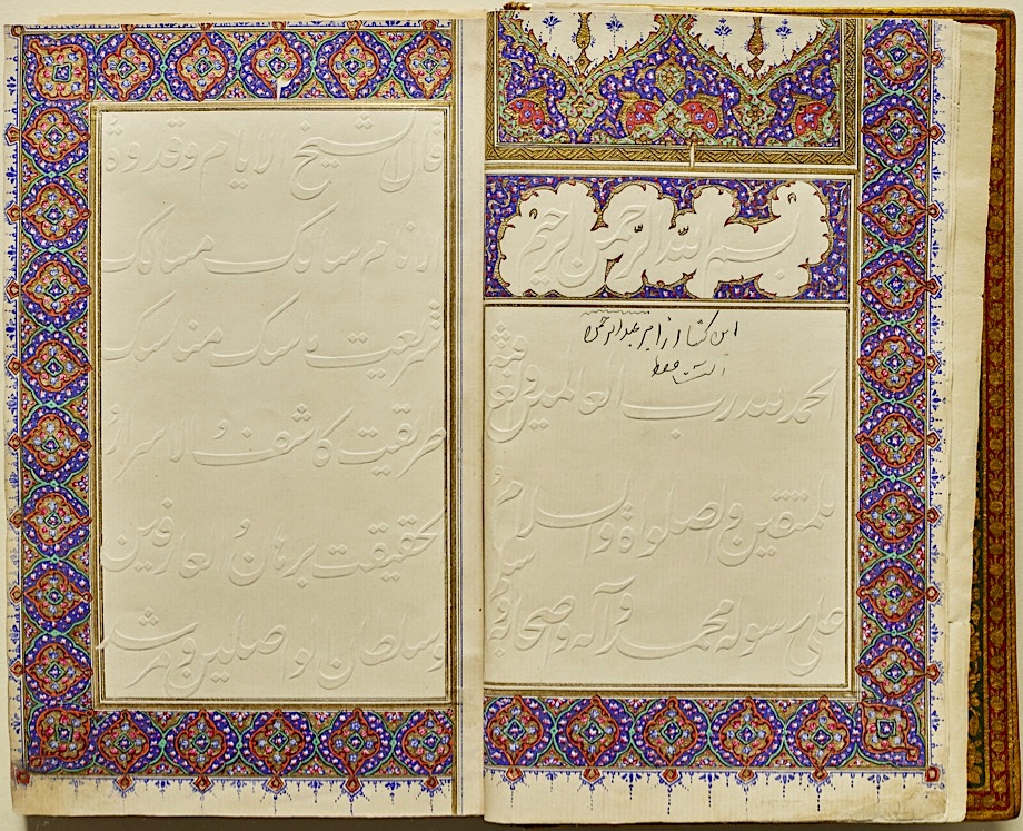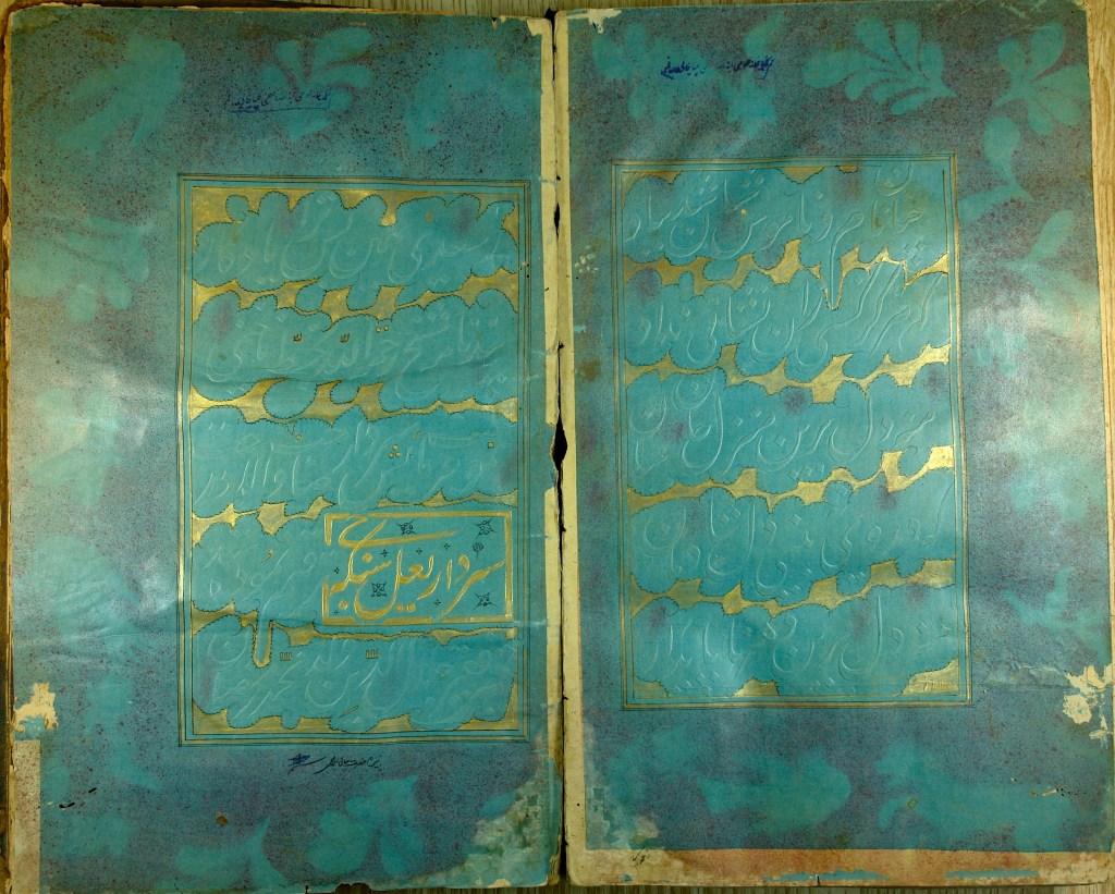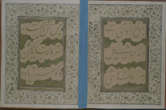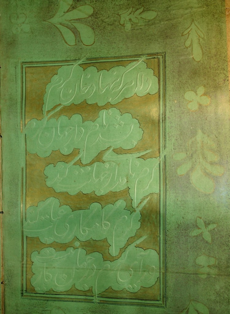 An Indian manuscript containing the wise words of Saʿdi Shirazi (1210–1292) is preserved at the Golpayegani Library in Qom (ms. no. 43484). The manuscript carries stencil decorations on the margins; the paper is tinted; and the background is gilded similar to the V&A album (fig. 2). The frontispiece is decorated with illumination and the verses are painted in gold (fig. 3).