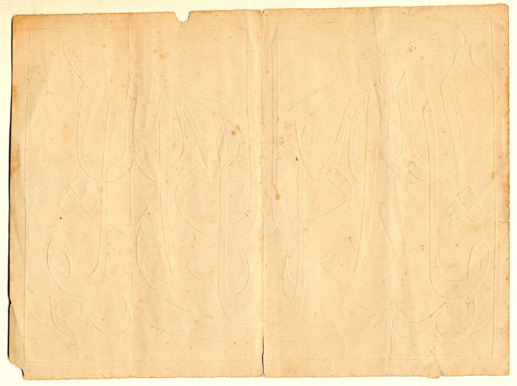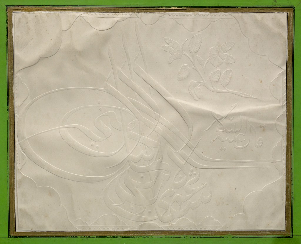 In Eski Eserler Ansiklopedisi (Encyclopedia of Antiquities) we read: “These are written with the lengthened nail of the thumb, by pressing down on the paper from the verso and turning the paper this way and that, thus leaving a trace on it. It can be likened to the embossed stamps used by some today. The inscription embossed on the paper is best seen when lit from the side. Smaller letters are shaped with a single trace, while larger ones are shaped by embossing the edges. In some cases, the margins of the inscription are decorated with flowers and branches also embossed with a nail”.[3]