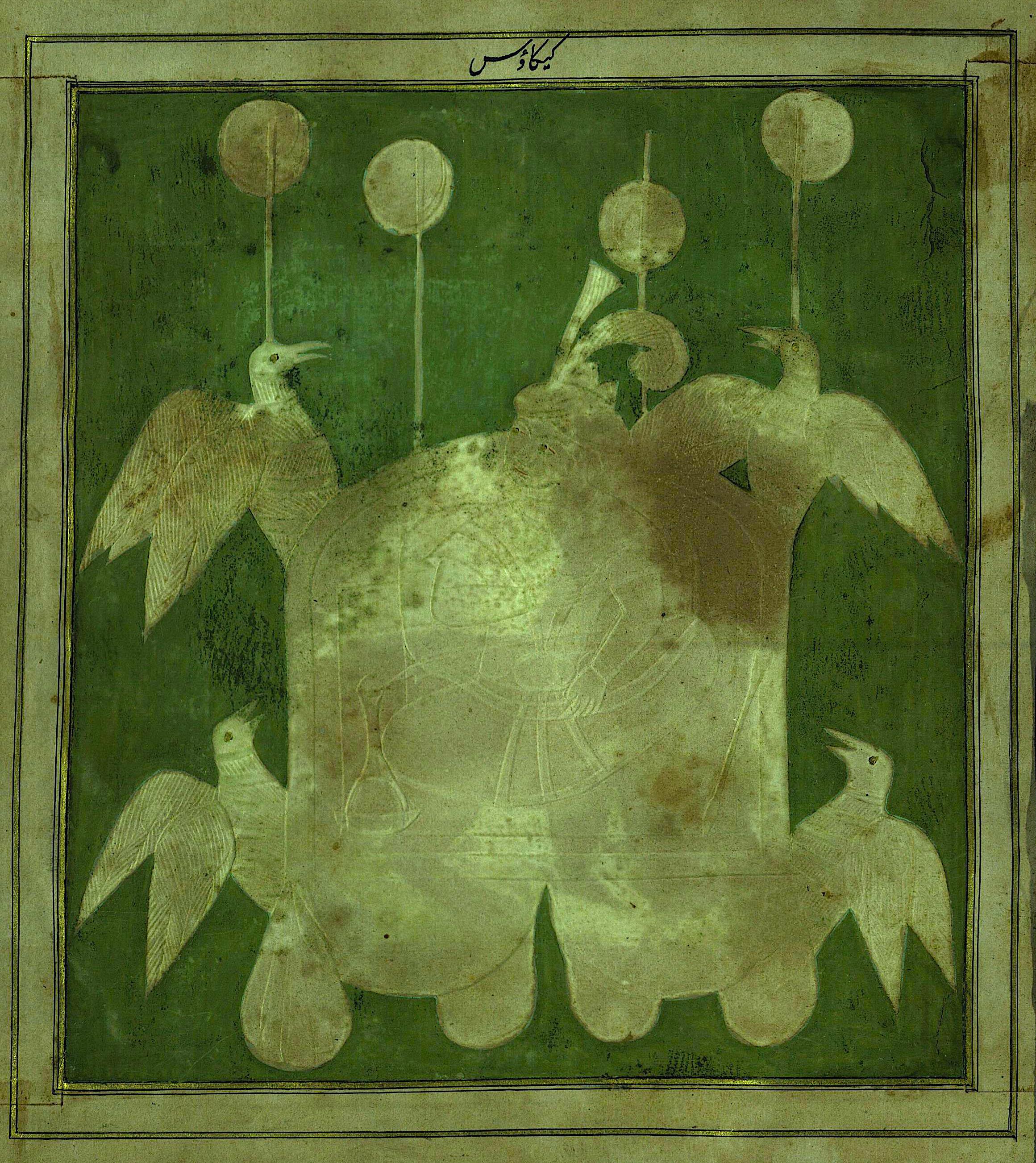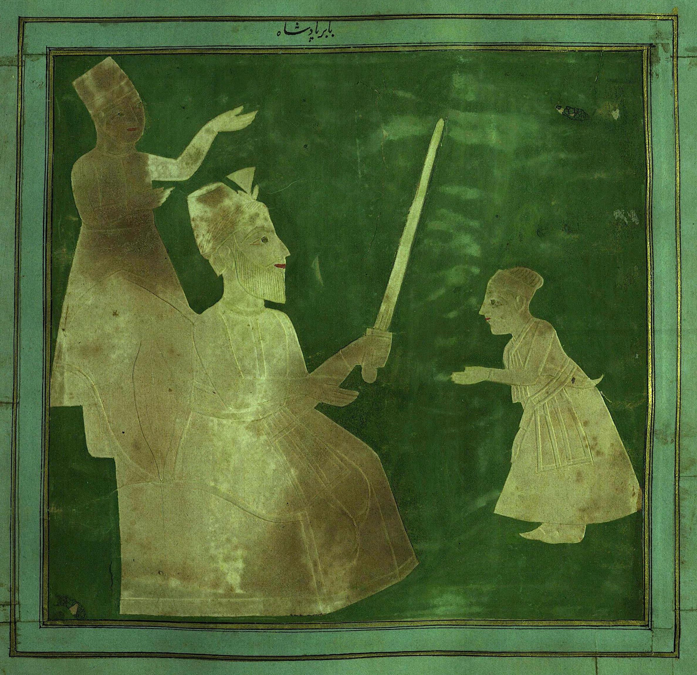 The album no. 9814 (University of Tehran) contains 106 fingernail artworks, including portraits of Indian, Iranian and even Afghan rulers; to name a few: Timur (Tamerlane), Babur (founder of the Mughal Empire), Jahangir, Shah Tahmasp Safavi, Shah Ismail Safavi, ‘Ali Adil Shah of Bijapur, Ahmad Shah Durrani, Burhan Nizam Shah, and even the ancient Persian King Kaykavus from the Shahnama (Book of Kings). The backgrounds in all drawings are painted dark green and usually the eyes of the figures and, in some cases, animals are painted with gold.