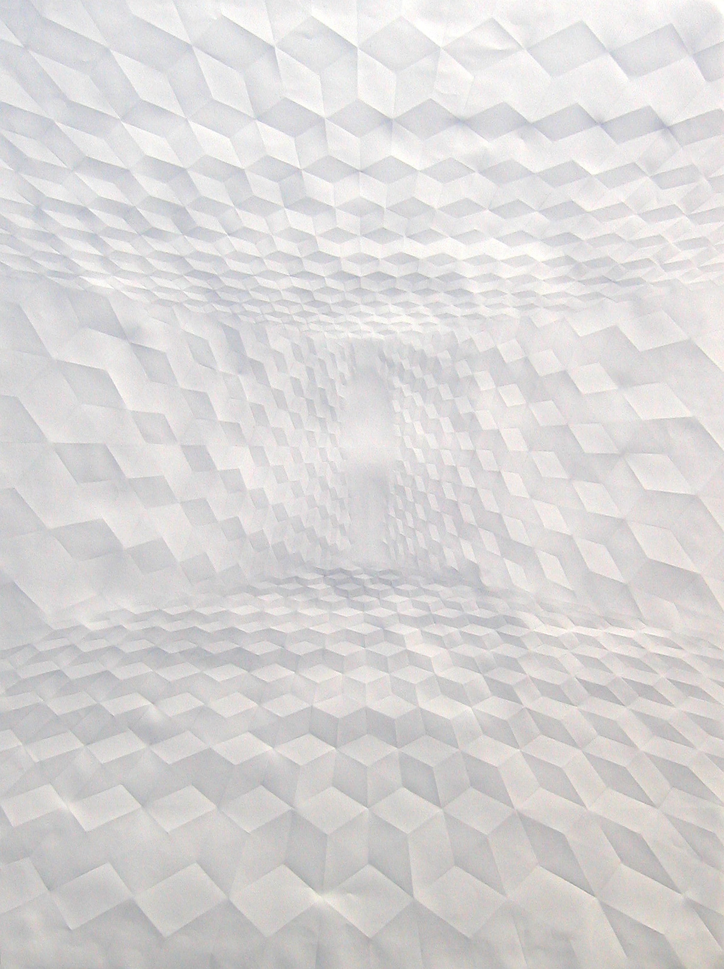 The contemporary artist Simon Schubert creates architectural bas-reliefs on paper on a colossal scale, which reflect a similar effect to Persian fingernail art, although in a different technique. For his “folded paper art”, he utilises special metal tools on wet paper, in addition to some embossing techniques for spheres or round forms (fig. 25). Schubert starts with sketches and then works with the tools from the smallest folds to the largest, and from the centre to the outer parts (fig. 26). He states: “I use paper from the point of view of a sculptor and one of the main ideas of my works is that I’m working on a fictional building which, in a way, unfolds from a sheet of paper through folding into a three-dimensional building. Every picture and every installation is part of this growing architectural complex”.[11]