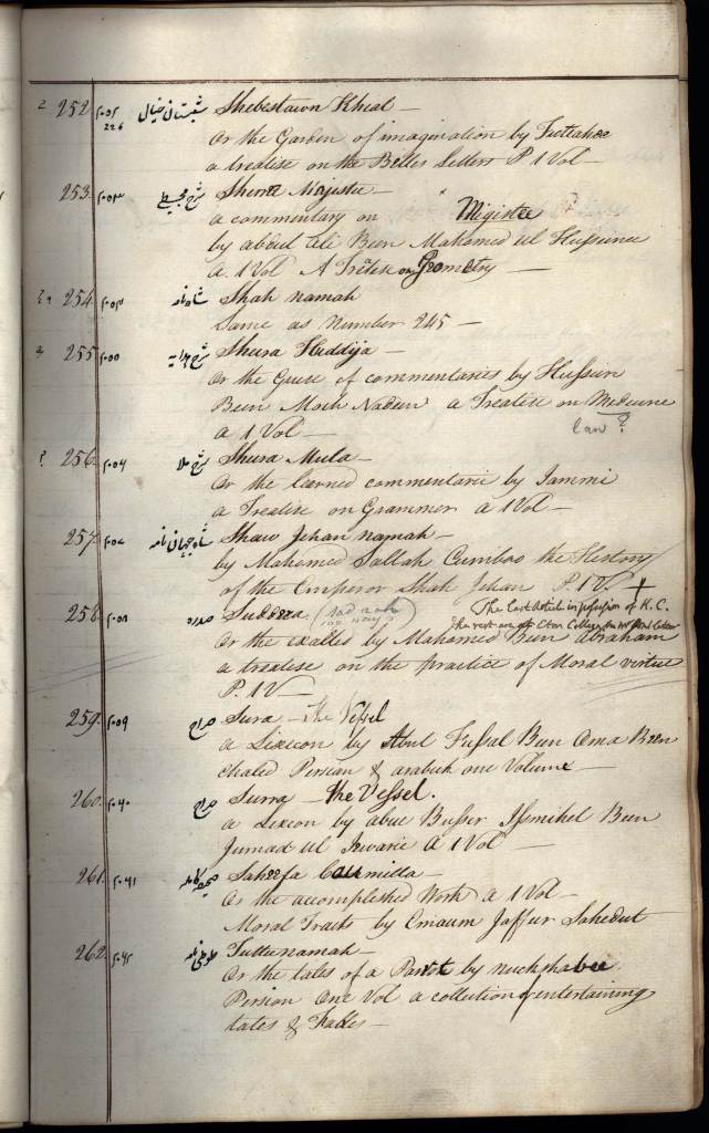 Pote’s catalogue of his newly acquired collection, prepared in India, arrived in England in 1794. Although it is a handsome object, this catalogue is not easily related to the manuscripts themselves and it has been little used. However, since it is extant in the King’s College Archive (LIB/10/2), it is possible this catalogue would have some value in determining the contents of the few manuscripts which were subsequently lost.