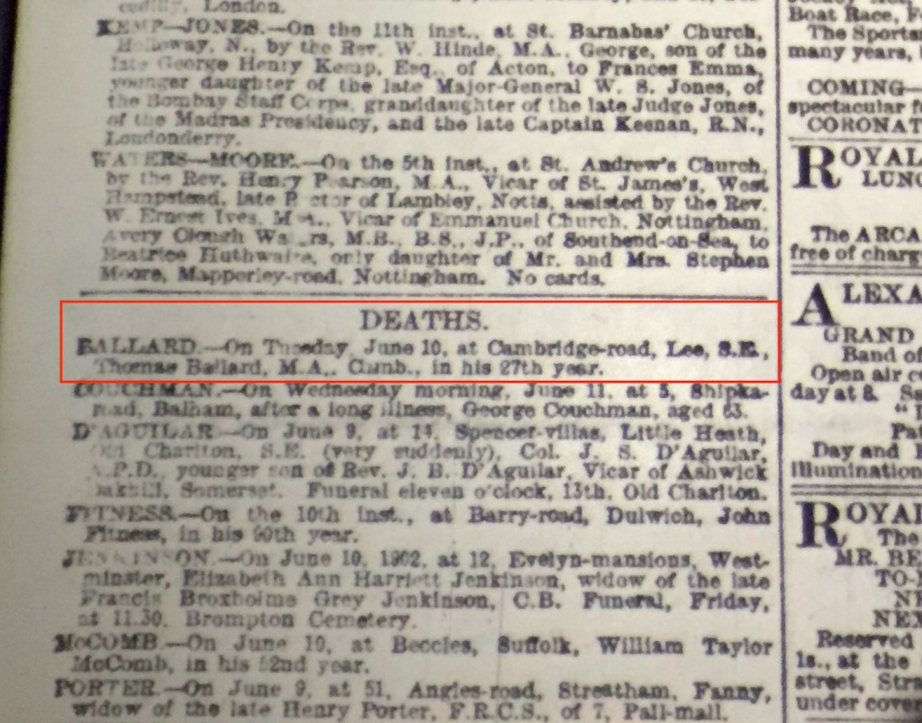I have not been able to find much information about Mr. Ballard (even from Clare College), except for the report of his death at the age of 27 in The Daily Telegraph of June 12, 1902.