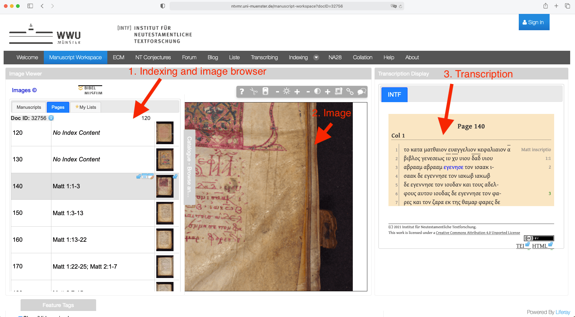 The transcriptions are available in TEI and HTML and are free to download under a Creative Commons CC BY 4.0 license. While these transcriptions are normally done by the INTF or other groups, such as the Institute for Textual Scholarship and Electronic Editing (ITSEE) in Birmingham, UK, it is also possible to see other individual users’ transcriptions.