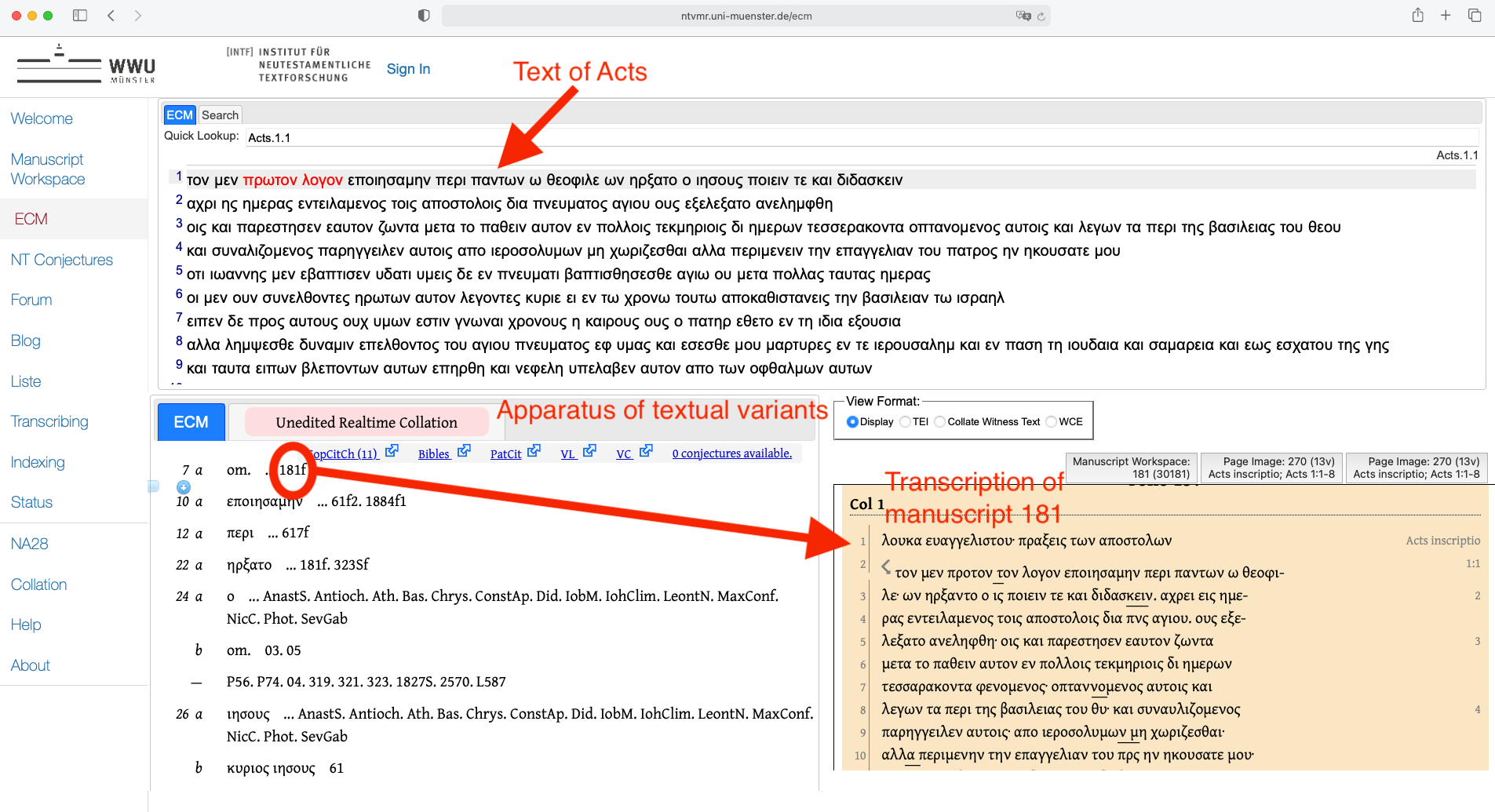 The ECM (mentioned above) is both a digital and printed edition of the Greek New Testament. Currently the ECM volume of Acts is available on the NTVMR and soon the Gospel of Mark will be online as well. The digital edition of Acts gives a full apparatus of textual variants from 183 Greek witnesses as well as other witnesses such as Coptic, Syriac, Latin, and ancient patristic sources.