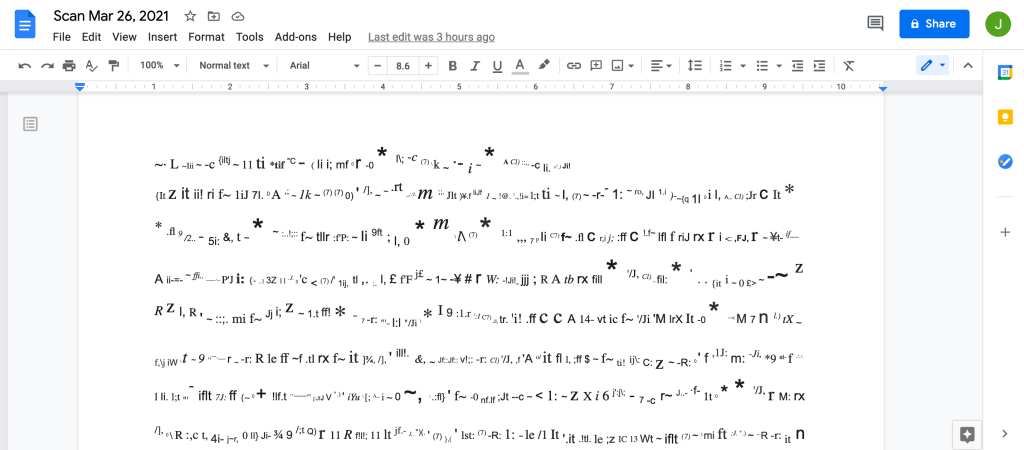 The first thing I learnt was that PDFs created with Adobe Scan generally do not produce good results when one attempts to automatically transcribe them using Google Docs. A lot of the scans that I had made with Adobe Scan returned completely nonsensical strings of symbols and characters.