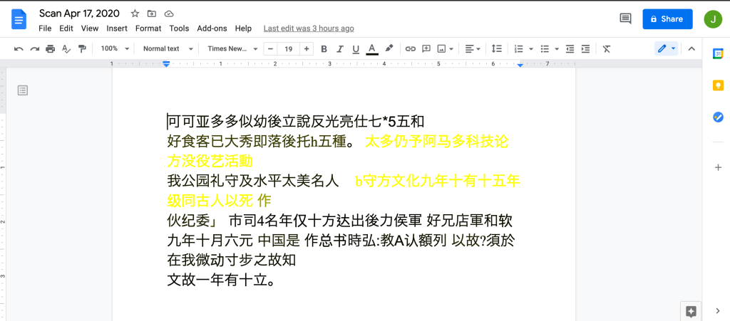 Using Google Docs to transcribe Japanese from scanned or photographed texts works well with particular sorts of documents, but has some limitations. I found that the method works best with PDFs of papers downloaded from journals or repositories, or PDFs created from photographs taken with a smartphone. It also functions well with non-cursive, handwritten pieces. The method usually produces some formatting issues, which can be easily resolved if the original text was written in horizontally aligned script, but can create difficulties if the text was vertically or multi-directionally aligned. It doesn’t seem to work well with items scanned using Adobe Scan and similar issues may arise when using other scanning apps. The Google Docs method of transcribing texts will likely become a key part of many of our research arsenals, but there is a long way to go before it can adequately transcribe the plethora of different textual forms we find in Japanese and likely other Asian languages.