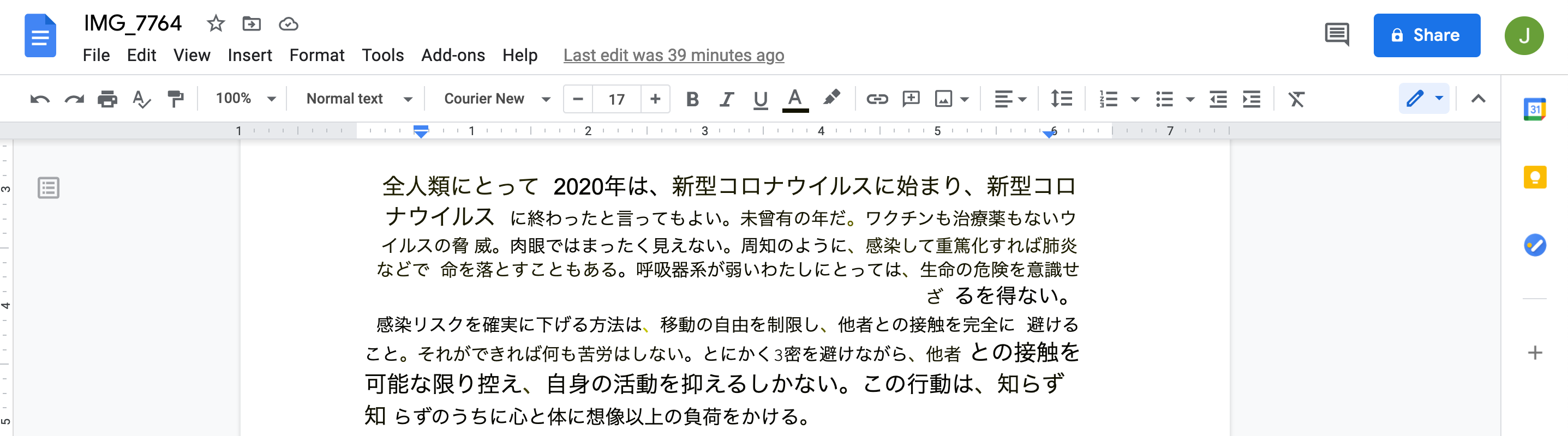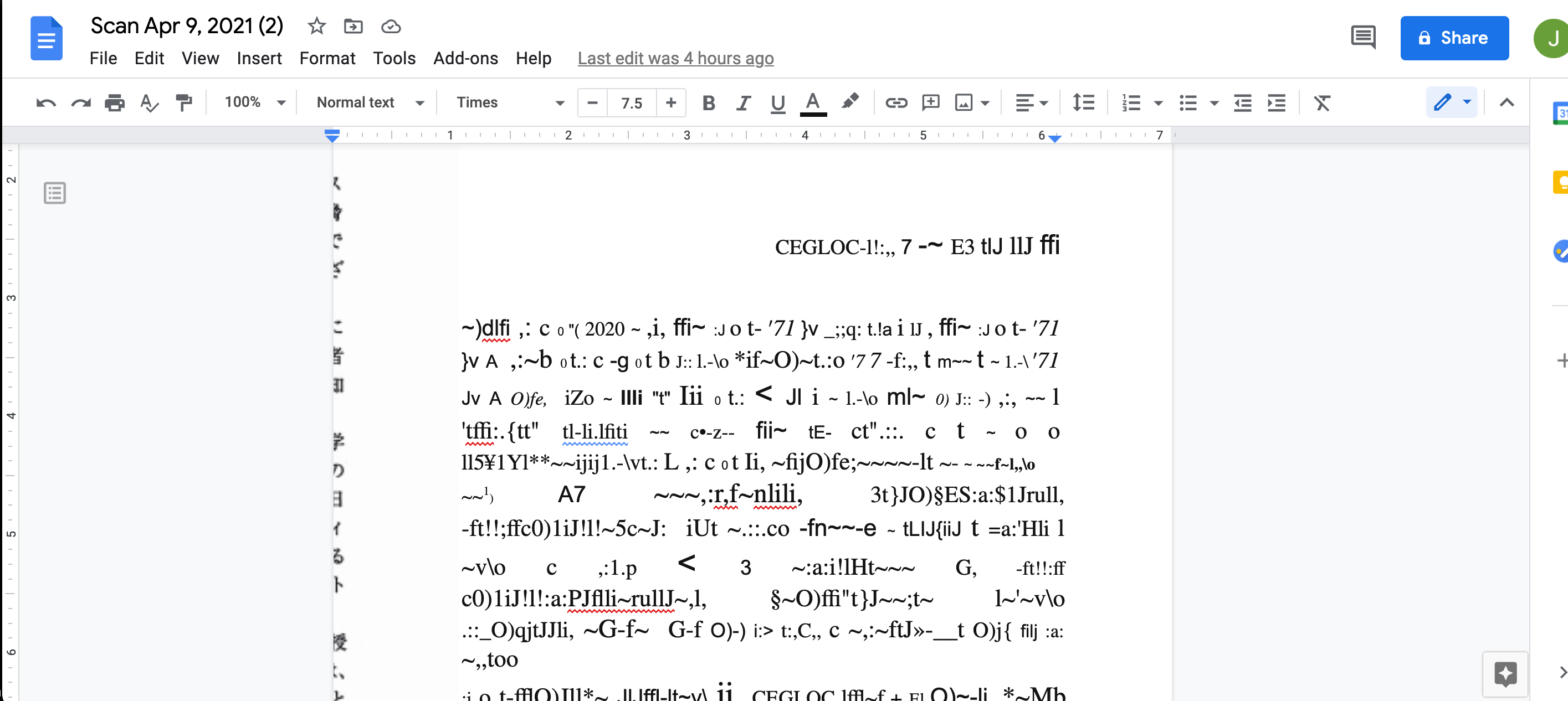 The third thing I found was that Google Docs works fairly well with photographs taken on one’s phone. I used Air Drop to move the photographs to my Mac, opened them in preview and then exported them as PDFs before uploading them to Google Drive. Again there were formatting issues, but Google Docs was able to recognize and render the contents of the text accurately. Below is a comparative example from Usuyama Toshinobu’s 臼山利信 “‘Korona ka’ no onrain kyōiku to komyunikēshon,” 「コロナ禍」のオンライン教育とコミュニケーション (2021). The first image is Google Docs’ transcription based on the photograph from my phone, the second image is the transcription based on a scan from Adobe Scan.