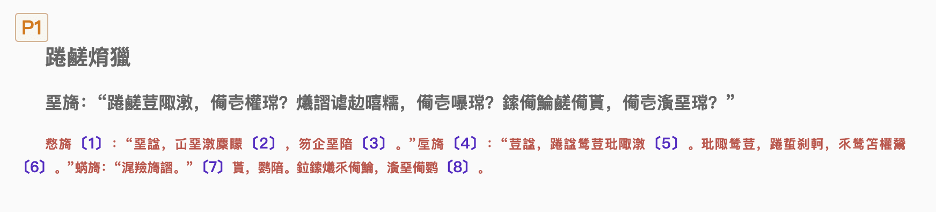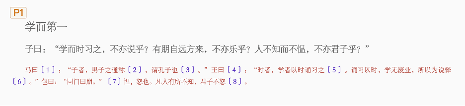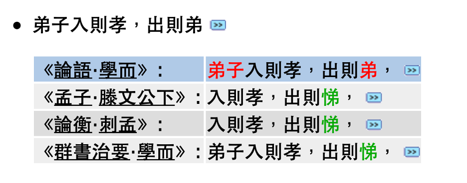 Ctext identifies three parallels for the Analects 1.6 sentence “弟子入則孝,出則弟,” nicely highlighting in colors the differences among them. We can only guess that this parallel is identified because of the shared sentence “入則孝,出則” (and arguably the close relationship between di 弟 and ti 悌). The criteria for this result are not clear (how many characters must be the same, and how many may be phonetic loans, for a sentence to be considered parallel?), nor is the algorithm that leads to this result. This would be of great help in creating new digital tools working with a language where phonetic loans and variants recur frequently, even more so with the new evidence from bamboo manuscripts.