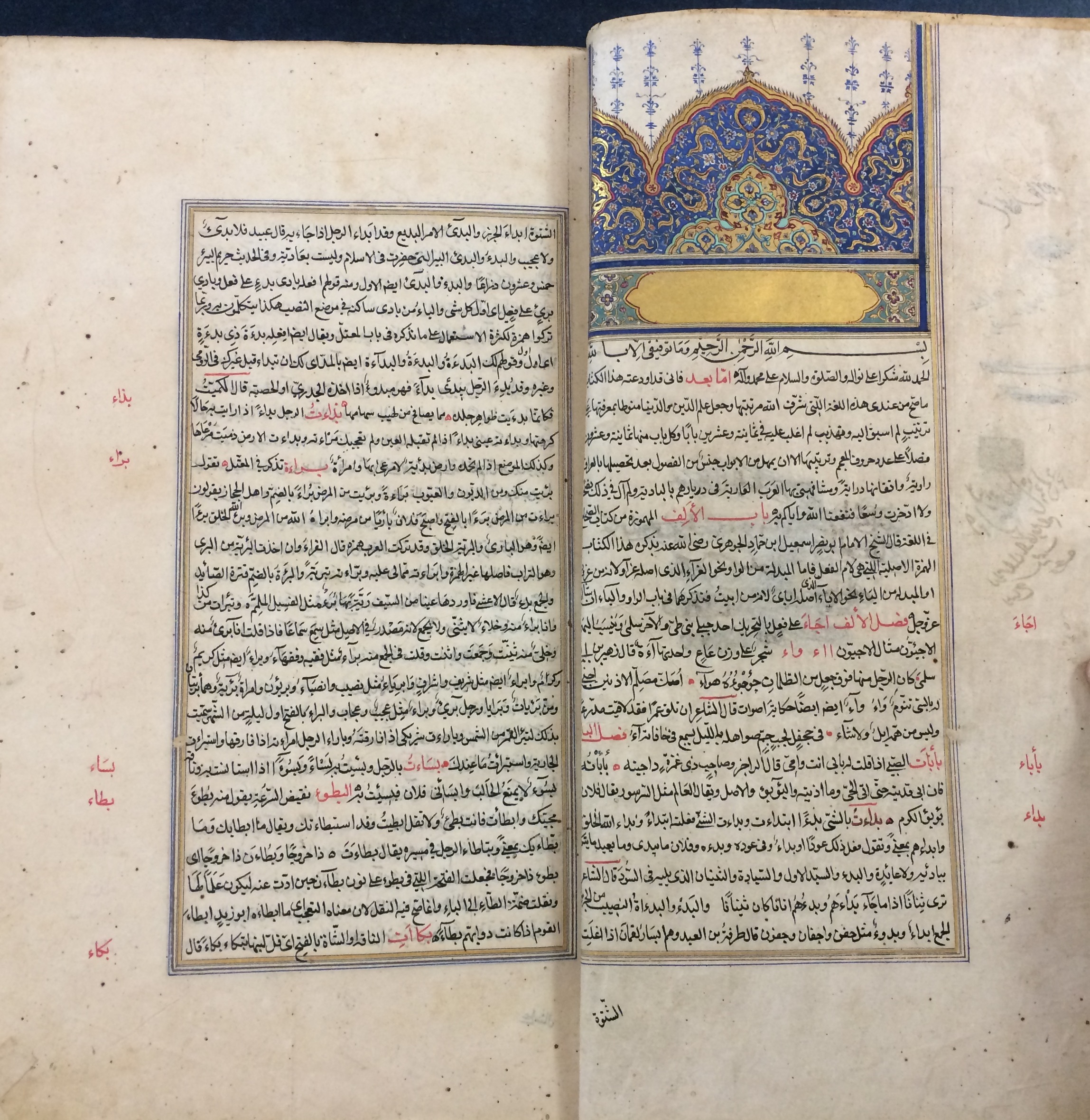 Eton 266: Al-Ṣurāḥ min al-Ṣiḥāḥ. The epitome of the Ṣiḥāḥ of Jauharī containing Persian rendering of the Arabic words, carries an illuminated shamsa and a double-page illuminated opening with a colourful sarlauh.
