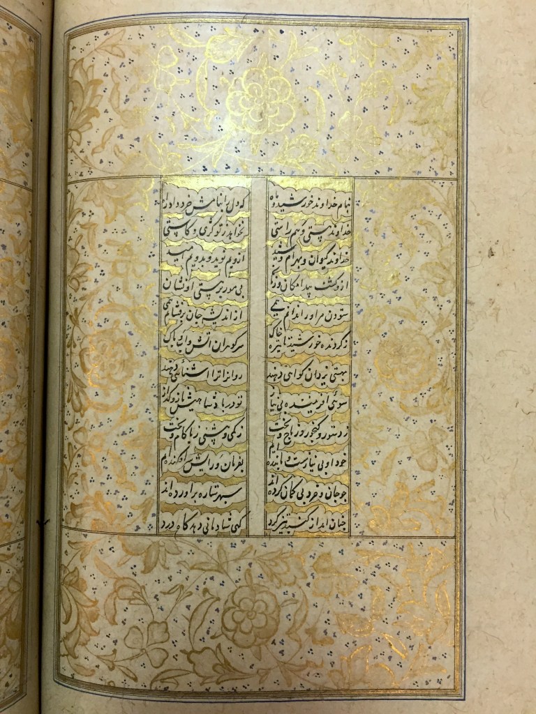 Eton 397: Mufradāt. A calligraphy treatise on nasta’liq, based on the instructions of the canoniser of the script Mir ‘Ali Tabrizi. The scribe signs his name as Ahmad al-Husayni, and it is dated 962/1555. Each folio contains a calligraphy specimen within illuminated frames and gold-speckled borders.
