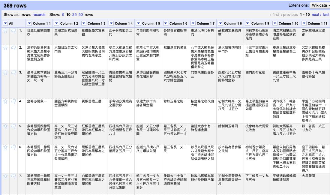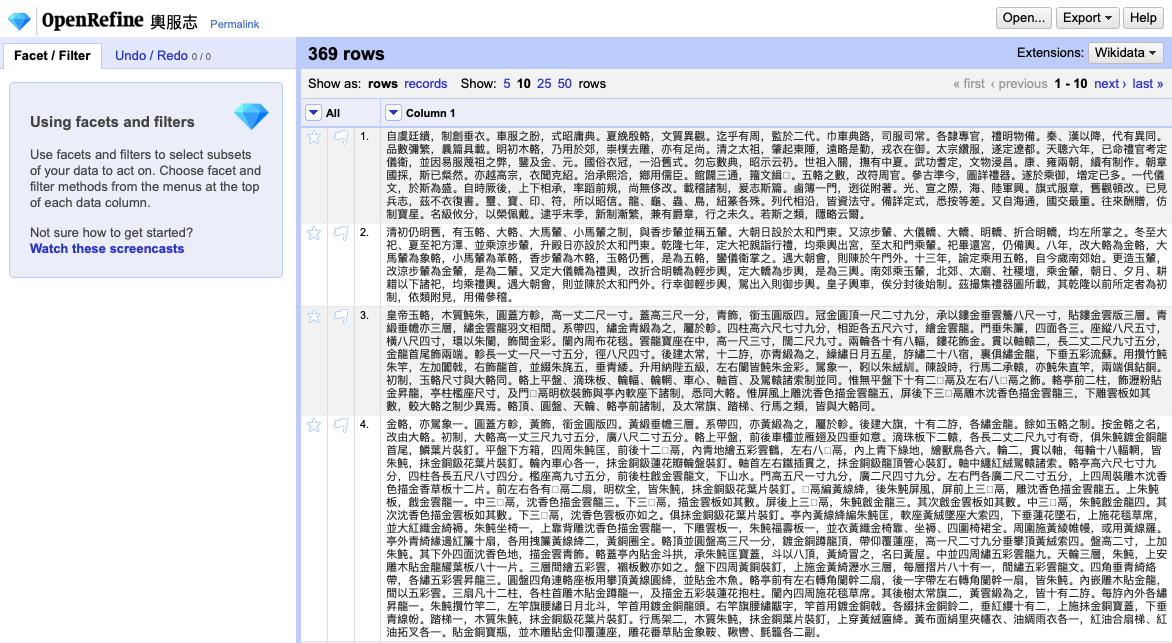 This post will use the Qing dynasty code of conduct “Yüfú zhì 輿服志” from Qīng shǐ gǎo 清史稿 for demonstration. A reliable digital version of Yüfú zhì can be obtained from the digital library Chinese Text Project (from Zhì qīshíqī 志七十七 to Zhì bāshí 志八十). As previously introduced, logging into the system allows the full text to be downloaded in plain text. Hence we can have the full text of Yüfú zhì stored in a txt file on the local computer. By using the method discussed in the previous post, punctuation can be removed with OpenRefine so that the text is all ready for analysis (for an alternative method see “Some thoughts on regular expressions” by Mariana Zorkina). However, this time we will explore some additional techniques provided by OpenRefine for more advanced treatment of the text.
