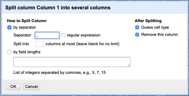 We first remove all punctuation marks except for the periods to achieve a clean text (the method can be found in the previous post). Then, from the drop-down menu of “Column 1” we choose the “Split into several columns…” option under the “Edit column”. Type in your separator, which in this case is a Chinese period ” 。” (fig. 2).