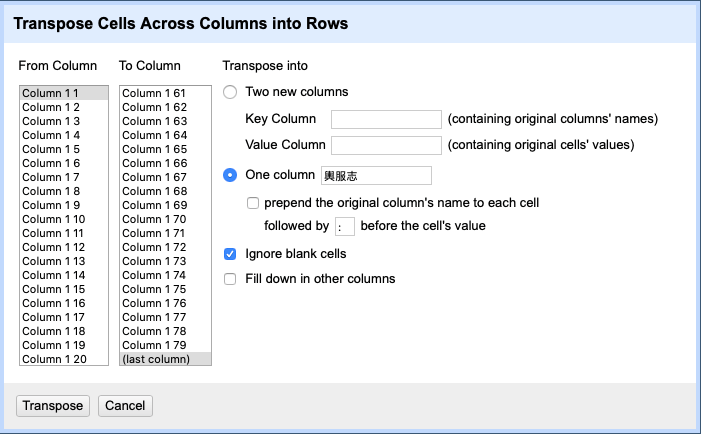 Filtering is the next task. It allows us to select or filter sentences that we do or do not wish to include in our project. It should be noted that OpenRefine functions like Excel in many ways, so it treats data in the same row as a unit. Therefore, to edit each sentence as an individual unit, we will need to transpose columns into rows. To do this, we select the “Transpose cells across columns into rows…” option under “Transpose” from the drop-down menu of any column. In the pop-up window we select all columns, and then choose “One column” and name it 輿服志 (fig. 4).