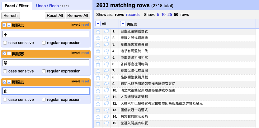Released by the Qing government and documented by later intellectuals, Yüfú zhì consists of a series of directives regarding attire and carriages that should be followed by people of each social stratum, from the emperor to commoners. The text mainly specifies rules that need to be obeyed, but occasionally it describes practices that are prohibited. Considering this feature of Yüfú zhì, a more accurate textual analysis can be pursued targeting on either the permissions or the prohibitions. With the help of OpenRefine, it is possible to select or filter out sentences that describe prohibitions by identifying certain keywords that are included in the sentences. In the pre-modern Chinese language, characters that indicate the prohibitions of actions usually include no (bù 不), forbid (jìn 禁), and stop (zhǐ 止), and thus by locating these keywords we will be able to identify sentences indicating prohibitive rules in Yüfú zhì.