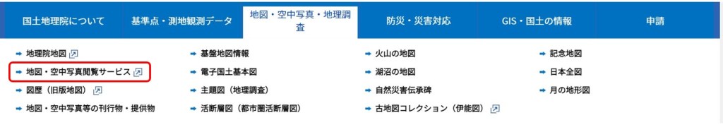 Opening the database link will present the main search page. After mousing over the center tab, you will be presented with several choices. Some of these may be better suited to your project, but for this guide I will focus on the “Maps, Aerial Photos, and Geographical Service” (地図・空中写真・地理調査サービス) heading, marked in red below.