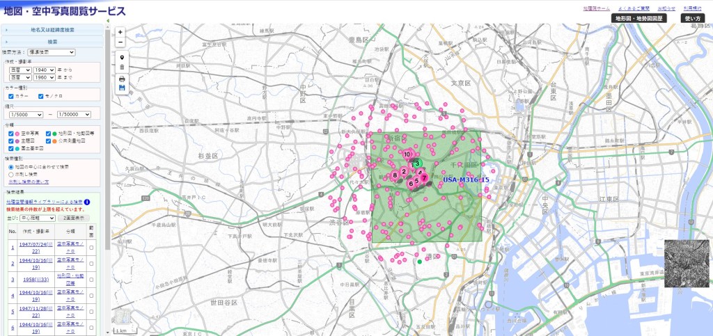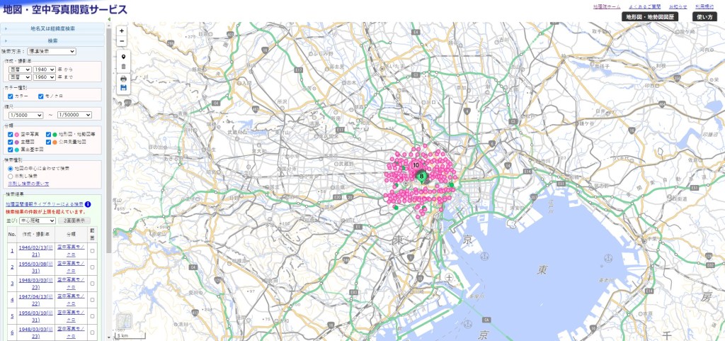 I set the date span to 1940-1960. For broad results, I selected both color and black and white images. I set the scale to 1/5000-1/50000, which is about half of the possible scale range; I find this is good for keeping the results within a fairly manageable scale-range, though some projects might demand a greater or lesser scale. I selected all possible formats to yield the highest variety of image results. With these parameters set, zooming closer to Japan on the map will automatically populate it with results depending on what location is centered in your map pane. It may take a few tries, but simply pull the geographical site to the center of the pane to activate the search. As you can see, I have generally centered the Tokyo metro area.