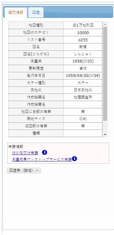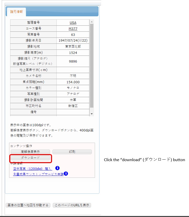One thing to note is that some of these images must be paid for using the service request form and picked up in-person at the GSI office in Ibaraki Prefecture. Others are free to download. After clicking on a given image (again, either directly from the map or from the list pane to the left), if you see the following message in blue beneath the image metadata it means that immediate download is not possible and that payment and in-person pick up is necessary: