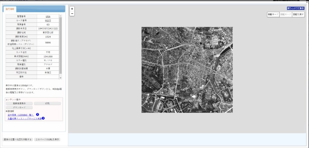 As you can see, it is a black and white aerial photo dated 1947 and taken by a US military plane (note “USA” at the top). At the bottom of the list is the specific area of Tokyo captured in this photo, in this case the Shinjuku ward (新宿区). You or your student might consider copying this location name into a web dictionary for greater context of what appears in the image, and then use Google Maps to confirm the precise location.