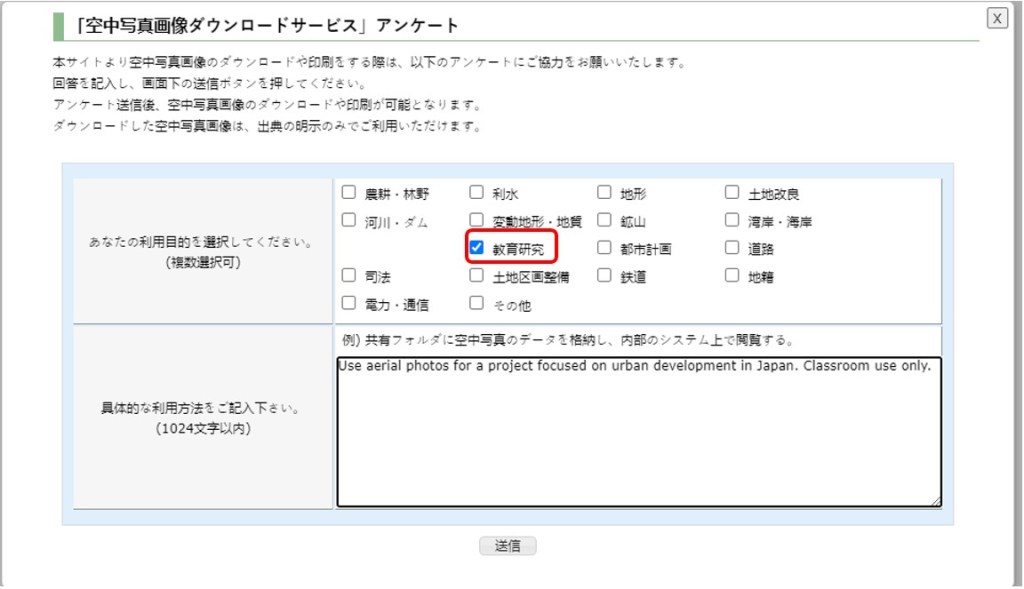 Clicking “download” will open a final message asking you to give some brief information on your intended use of the image, likely for GSI’s internal records of use history and future development of the database and interface. You need not be exhaustive here. As you can see in the following image, I have checked the box for “Educational Research” (教育研究), and have added only a brief sentence or two (in English!) to describe my intended use. There is no need to provide Japanese in the text box. Clicking the single submit button at the bottom of this box will start the download immediately. Conveniently, filling out this form only once during a session will allow you to download several images in a sitting. If you close your browser or start a search with new parameters, you will have to fill out this form again.