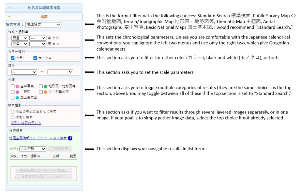 One of the most important and influential components of this search interface is the format category for filtering results (e.g. Public Survey Map, Terrain/Topographic Map, Thematic Map, etc). I tend to leave this selection on “Standard Search,” and then toggle the results using the middle, five-colored section for result categories, as necessary. Broadly, this will determine the type of image data presented to you and can drastically affect the number of results. Another important component is the date range. Depending on the year, the number and type of results may vary drastically, as well. For example, prior to 1910, aerial photography was not possible in Japan, so delimiting the date range to earlier years will not yield any results in the aerial photography category. The more you tinker with the result formats and dates, the easier it becomes to expand and contract your pool of results.