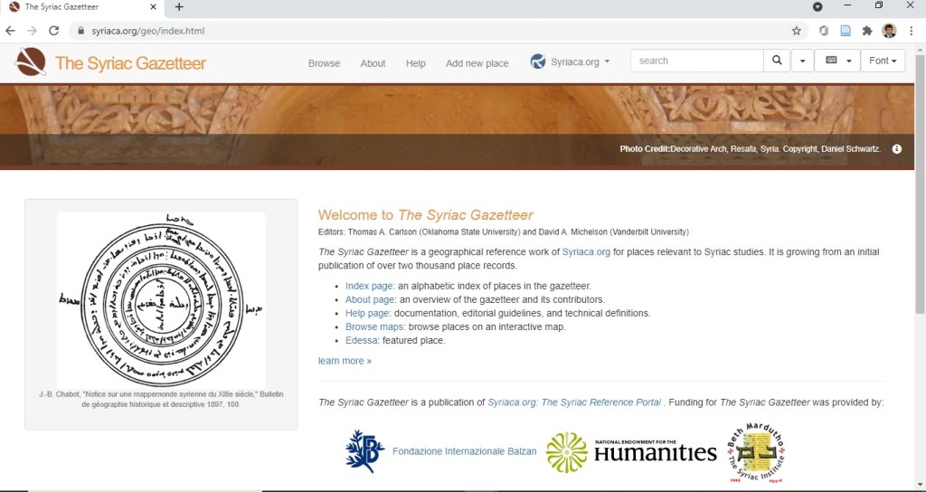 Places: The Syriac Gazetteer (ed. Thomas A. Carlson and David A. Michelson, https://syriaca.org/geo) provides reference entries for over 2000 places with names (typically English, Syriac, and Arabic), location coordinates (where available), relations to other places, and links to Pleiades and Wikipedia.