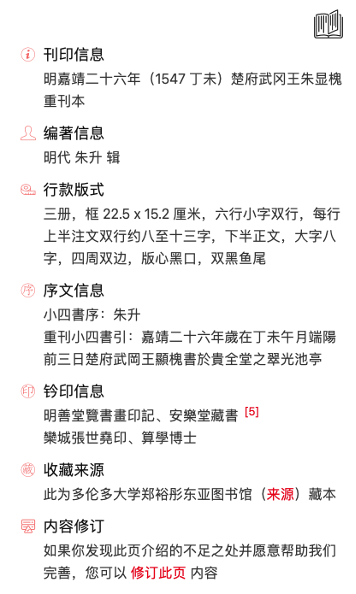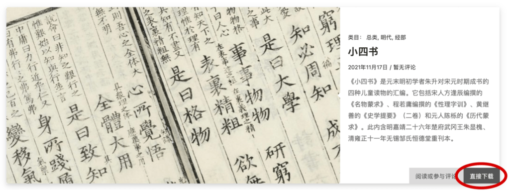 In the case of multiple editions, you can select the one you need via the icons right after the blurb. For example, for the “Four Small Books” there is a Ming dynasty edition (on the left) and a Qing dynasty one (on the right).