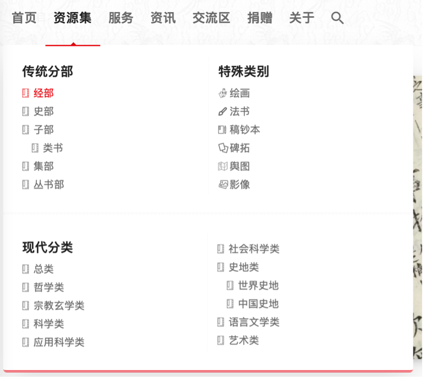 For texts, hover over the Resources 資源集 section in the menu on the top left, and a menu will appear. Click on any of the sections listed under Traditional Collections 傳統分部, and for each you will be taken to the corresponding page that lists all the resources uploaded under that section, ordered by date.