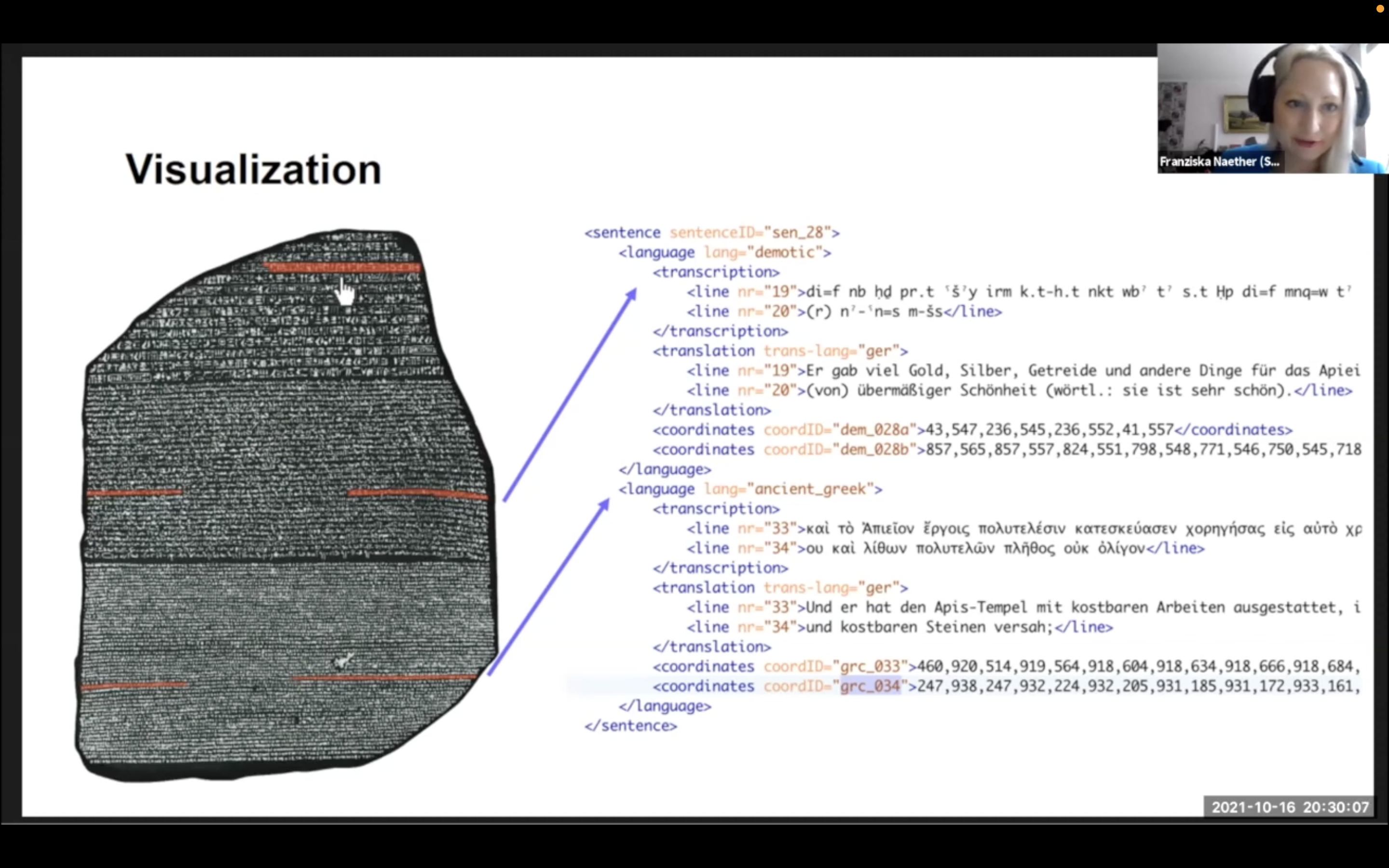 The first case presented in my talk is the Digital Rosetta Stone Project, an endeavor which started in 2015. This is a digital edition of the text of the Rosetta Stone, making use of treebanking and alignment technologies on the basis of new 3D images. What is new in 2020/2021? The analogue and digital artifact with its trilingual priestly decree will be featured in two upcoming exhibitions in 2022 celebrating the bicentennial decipherment of Ancient Egyptian in the British Museum in London and the Egyptian Museum in Leipzig. Our team still has to work on further processing the 3D images that we obtained in London by a technology called “shape from shading”, and to continue on the treebanking of Demotic Egyptian. In order to inform about what we have achieved so far, I invite you to check out our digital exhibition which is available in English and German. This summarizes the work done so far and includes many links including online lectures and classes, e.g. within the Sunoikisis Digital Classics curriculum that is openly available to everyone.