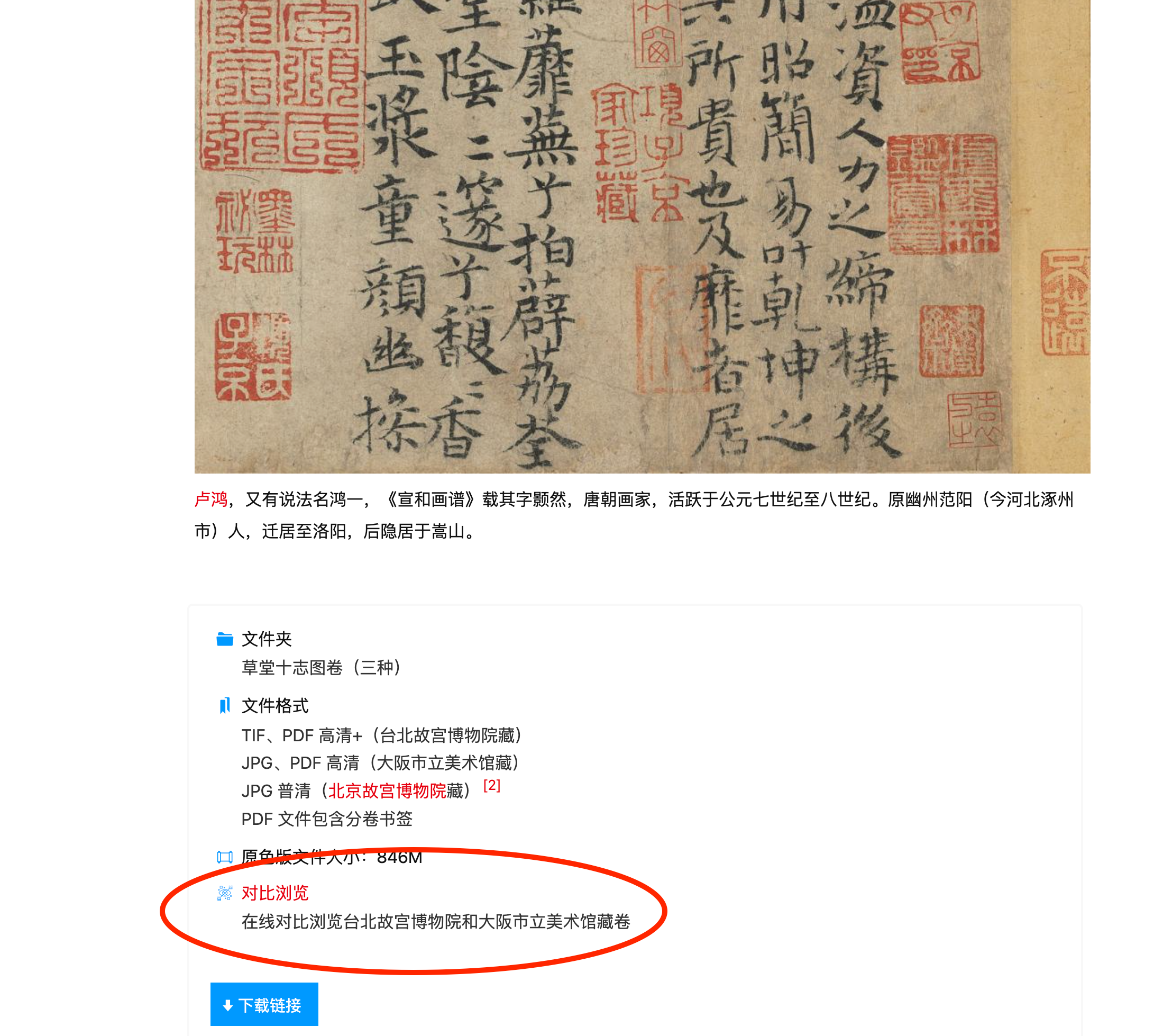 One way that Shuge addresses these issues in its special collections is through the “comparing editions” (對比瀏覽) viewer function. With this function, viewers can look through two extant editions of the same handscroll composition, side by side. For example, in the entry on the Ten Views from a Thatched Hut (草堂十志圖卷) handscroll, which exists in two compositions in Taipei and Osaka collections, visitors can compare both handscrolls in the same digital viewer. Similar interfaces are beginning to be explored in other image-centered digitization projects, such as the “East Asian Scroll Paintings” project at the University of Chicago’s Center for Art for Art of East Asia, which, aims to “simulate the experience of viewing handscrolls in ways that published photographs in books and projected slides cannot.” To this end, both Shuge and the East Asian Scroll Paintings project use a similar viewer technology, based on the Seadragon Javascript image viewer, “HandscrollViewer” (although the EASP viewer includes additional functions, such as horizontal auto-scroll).